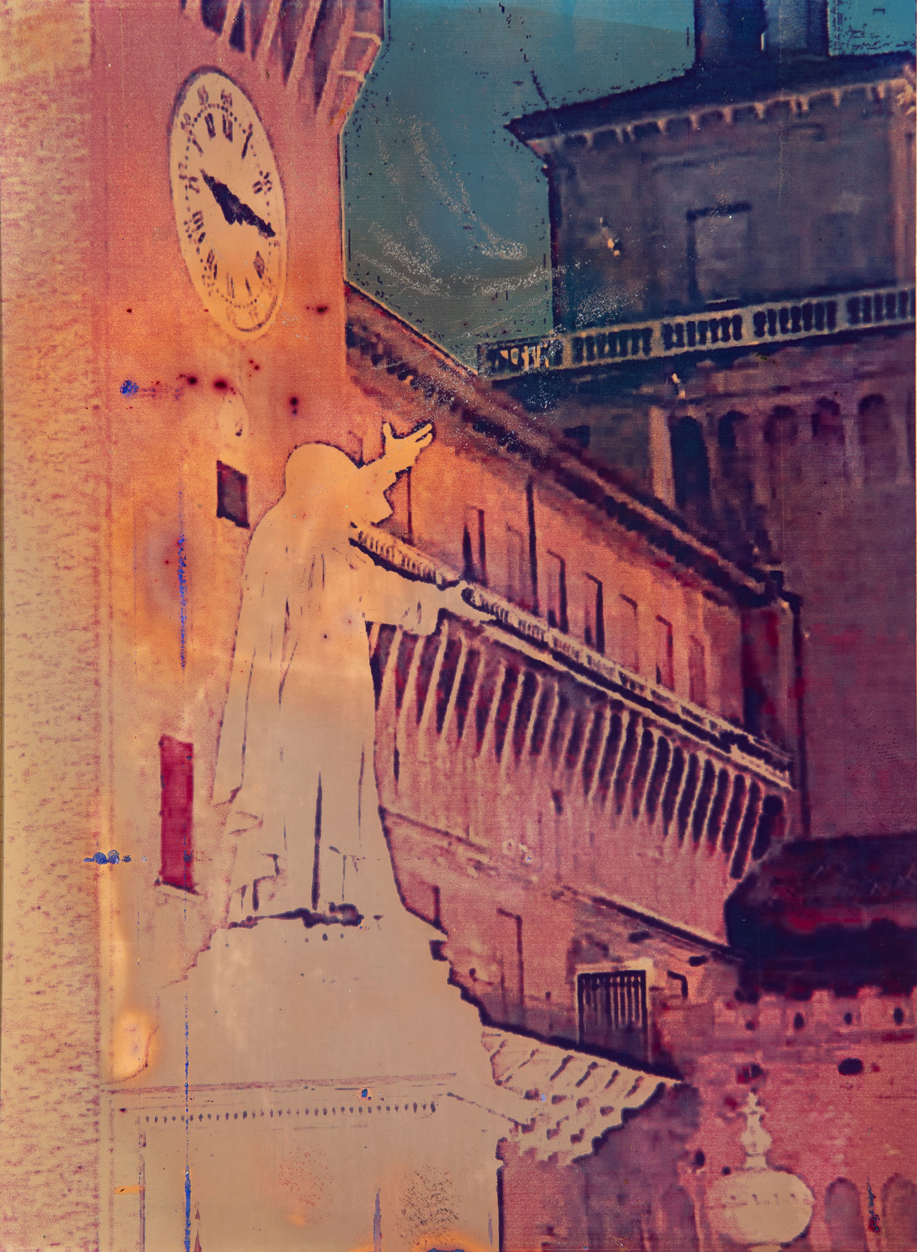 Tassi rianima le carte prodotte tra gli anni Sessanta e Ottanta per la fotografia analogica fissandoci sopra gli scatti, catturati con una camera digitale, con un'emulsione di acrilici e inchiostri gettata da una stampante "truccata" da lui stesso progettata. Concepiti per rispondere alla luce e agli agenti chimici e non per assorbire pigmenti, i supporti reagiscono dunque in maniera inaspettata, come dimostra la molteplicità dei risultati ottenuti. Queste carte "fuori tempo" impregnate di materia cromatica moderna vengono a porsi a tutti gli effetti come opere uniche, specificità che l'autore ribadisce operando su ognuna di esse una post-produzione ad hoc (abradendole con la carta vetrata o spruzzandogli sopra vernici spray); lavorazione che prosegue su quelle sviluppate in grande formato. Questo procedimento tecnico, che tiene idealmente assieme due epoche (quella in cui la realtà veniva trascritta chimicamente e quella in cui si è trovata ad essere convertita elettronicamente), infonde alle creazioni di Tassi un senso di temporalità stratificata, evocata altresì dalla commistione di inquadrature classiche ed effetti visivi che rinviano alla modernità della pittura astratta e informale. Nelle immagini di Tassi Ferrara appare, per dirla con d'Annunzio, nella sua «deserta bellezza», e subito eccede. La sua psichedelica fotografia post-digitale non fissa la realtà fisica della città, ma la interroga per indurci a superare i limiti del nostro sguardo.