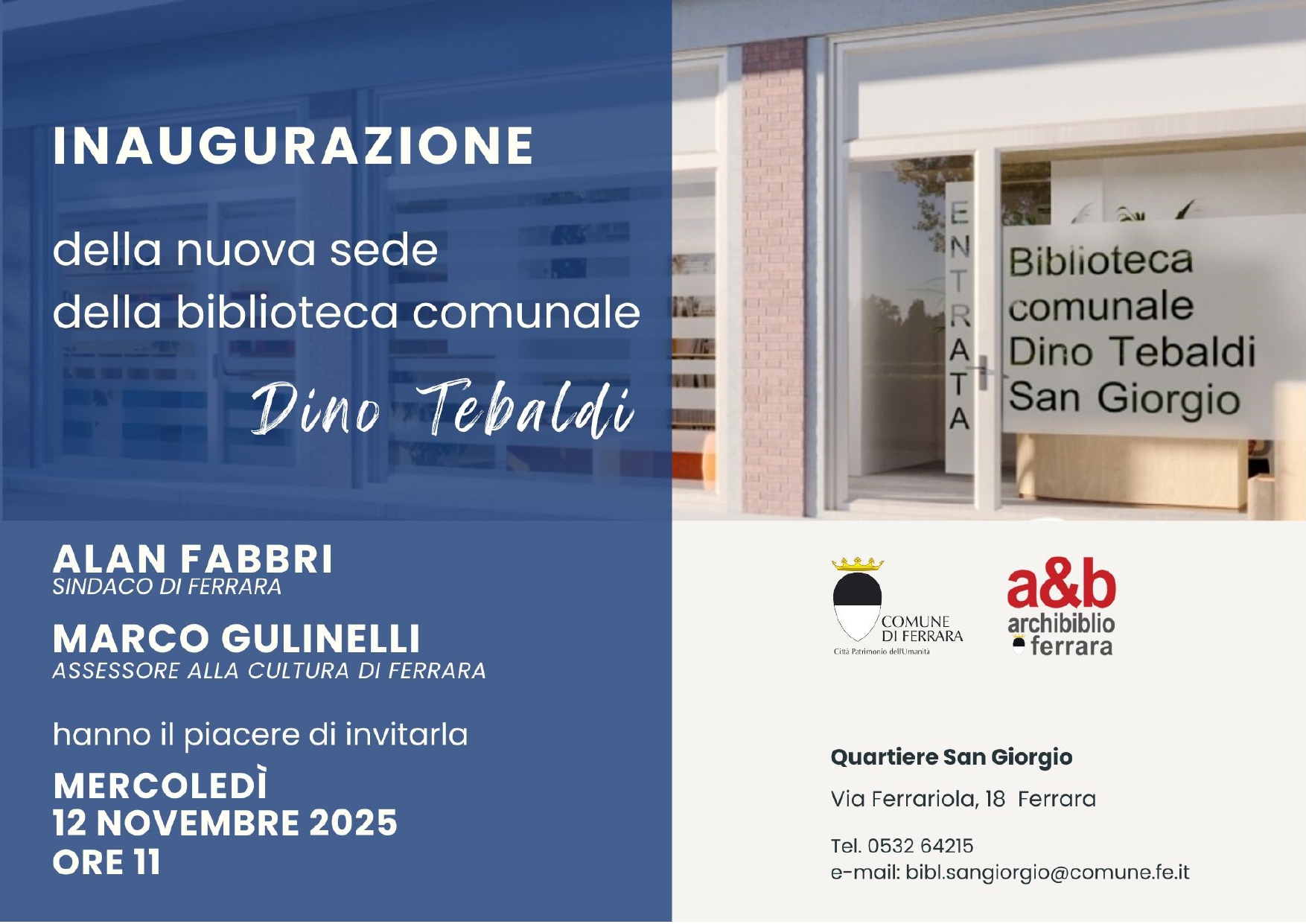 INAUGURAZIONE BIBLIOTECA - Mercoledì 12 novembre 2025 alle 11:00 in via Ferrariola 18 a Ferrara