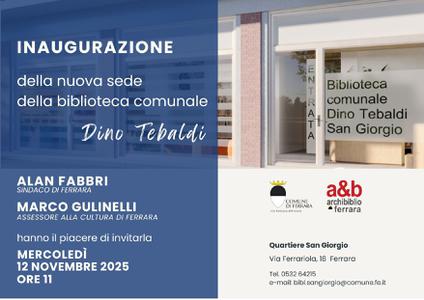 Mercoledì 12 novembre 2025 alle 11:00 in via Ferrariola 18 a Ferrara avrà luogo l'inaugurazione della nuova sede della Biblioteca comunale Dino Tebaldi.