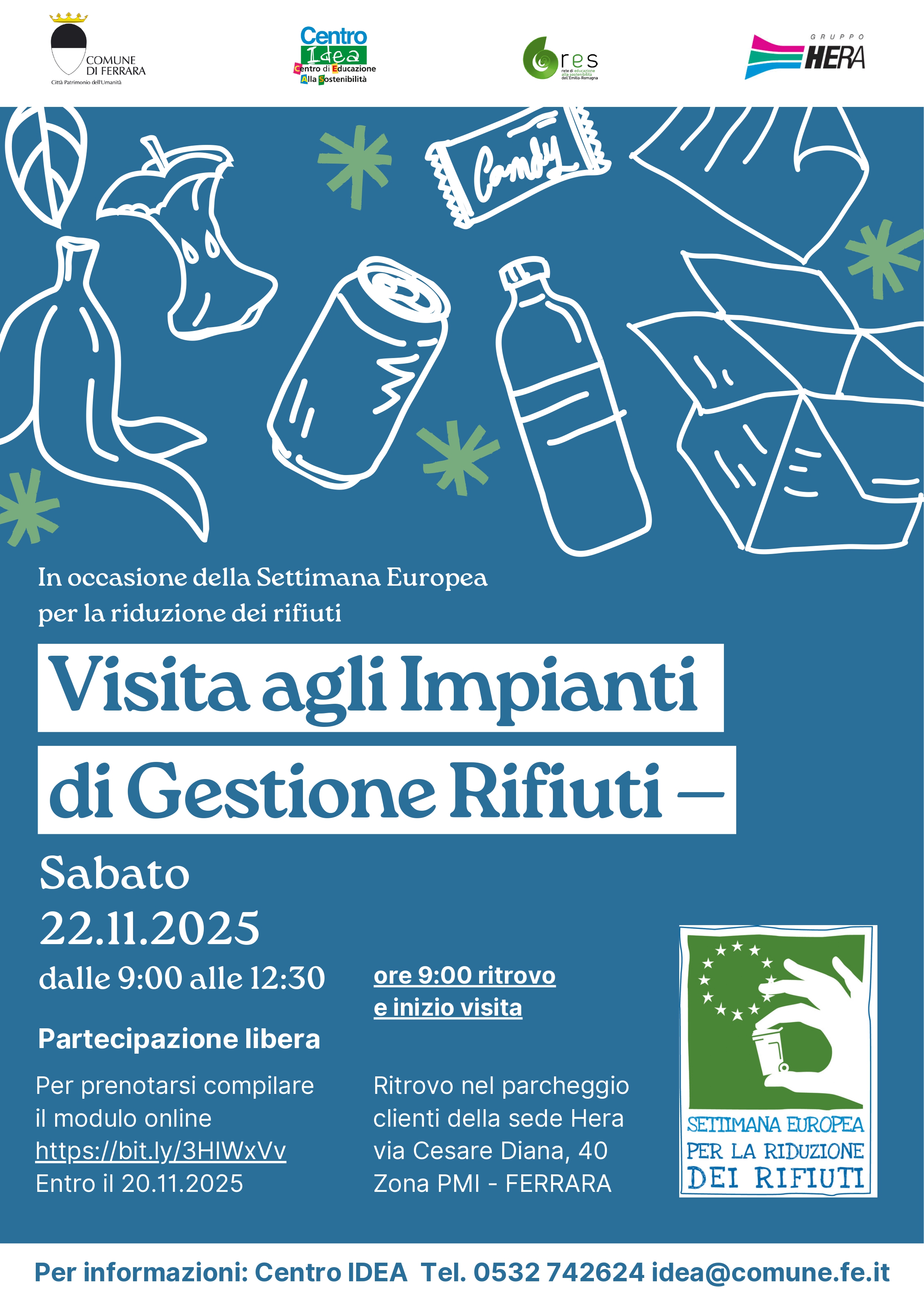 La Settimana Europea per la Riduzione dei Rifiuti (SERR) è un'iniziativa dedicata a sensibilizzare la cittadinanza sulla sostenibilità e sulla corretta gestione dei rifiuti. Anche nel 2025, il Comune di Ferrara parteciperà all'evento tramite il suo Centro di Educazione alla Sostenibilità IDEA, in collaborazione con il Gruppo Hera, organizzando una visita guidata agli impianti di selezione, recupero e trattamento dei rifiuti gestiti da Herambiente.