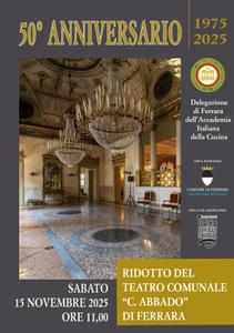 La Delegazione di Ferrara dell'Accademia Italiana della Cucina celebra il suo 50° anniversario con un momento d'incontro che si terrà sabato 15 novembre alle 11:00 al Ridotto del Teatro Comunale di Ferrara, iniziativa che gode del patrocinio del Comune di Ferrara e della collaborazione della Fondazione Teatro Comunale.