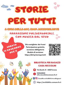 Un sabato mattina dedicato alla lettura in CAA (Comunicazione Aumentativa e Alternativa), LIS (Lingua dei Segni Italiana) e narrazioni multisensoriali accompagate da musica dal vivo per bambini dai 4 anni. L'appuntamento, a cura della cooperativa sociale Accaparlante è per sabato 15 novembre 2025 alle 11:00 alla biblioteca comunale Casa Niccolini (via Romiti 13, Ferrara), per il secondo di tre incontri con 'Storie per tutti',ciclo di letture animate divertenti e accessibili, attraverso narrazioni in CAA, esperienze polisensoriali, accompagnate da musica dal vivo e dall'interprete della Lingua dei Segni.
