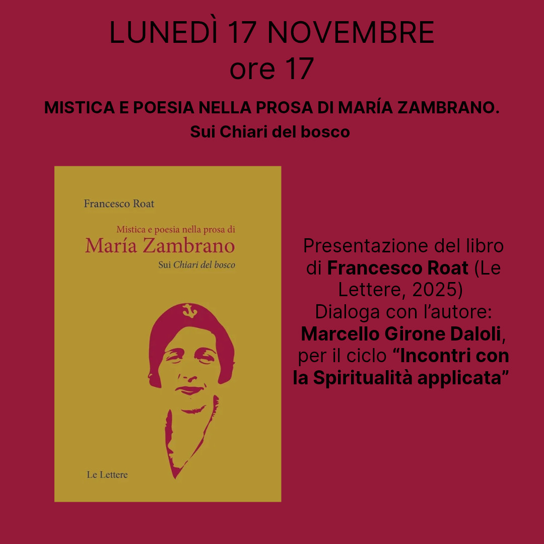 E' dedicato alle riflessioni della filosofa e saggista spagnola il libro di Francesco Roat dal titolo "Mistica e poesia nella prosa di María Zambrano" che lunedì 17 novembre 2025 alle 17:00 sarà presentato nella sala Agnelli della biblioteca comunale Ariostea (via delle Scienze 17, Ferrara).