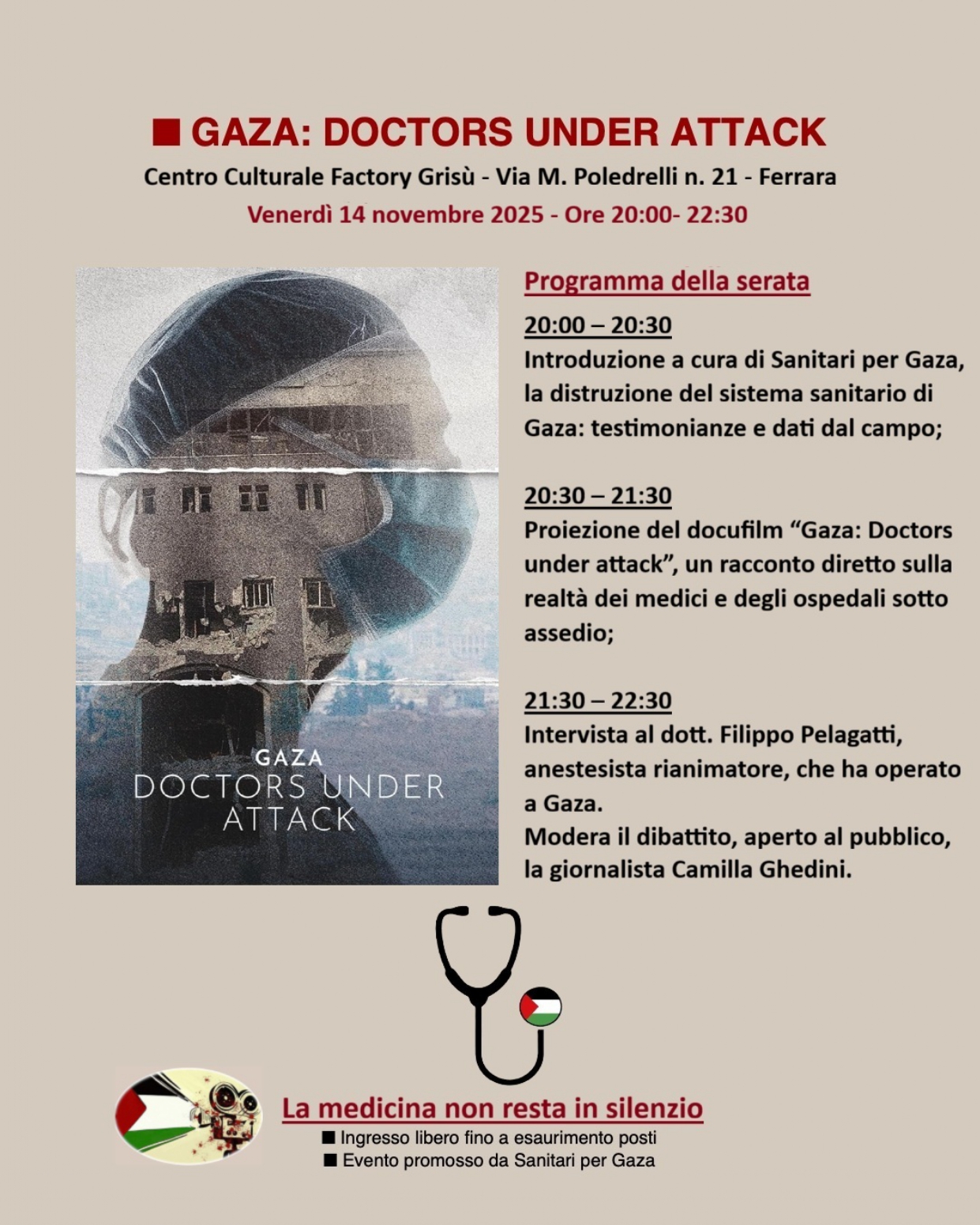 Raccontare Gaza attraverso un docufilm e le parole di chi a Gaza ha portato la propria professionalità di medico, vivendo respirando e toccando la guerra. Succederà venerdì 14 novembre 2025, dalle 20 alle 22.30, al Consorzio Factory Grisù (Via Poledrelli), in una serata di sensibilizzazione e confronto, aperta al pubblico, organizzata dalla sezione ferrarese di Sanitari per Gaza. Si comincerà con la proiezione del recente "Gaza: Doctors Under Attack", un'indagine forense sugli attacchi militari israeliani agli ospedali di Gaza, che analizza anche le accuse di violenze e abusi ai danni di medici e operatori sanitari nella Striscia. A seguire, dialogando con la giornalista Camilla Ghedini, interverrà Filippo Pelagatti, un giovane rianimatore dell'Ospedale Careggi di Firenze, che racconterà la sua esperienza all'ospedale Nasser Hospital di Khan Younis, bombardato durante le operazioni militari israeliane. La serata, ad accesso libero e gratuito, "rappresenta un'occasione di confronto e riflessione su quanto sta accadendo a Gaza e sul ruolo della comunità sanitaria internazionale".