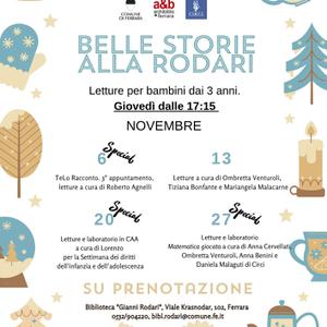 Tornano alla biblioteca comunale Rodari di Ferrara (viale Krasnodar 102) le "Belle Storie" per i più piccoli. L'appuntamento di giovedì 20 novembre 2025 alle 17:15, a cura di Lorenzo e Beatrice, sarà dedicato alla Settimana dei diritti dell'infanzia e dell'adolescenza, nell'ambito di 'Bimbi in festa'. Bambine e bambini dai 3 anni potranno ascoltare i racconti in Comunicazione Aumentativa Alternativa, concluderà il pomeriggio un laboratorio creativo.