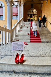 Nella mattinata di martedì 25 Novembre 2025, è stata coinvolta UDI sezione di Ferrara per l'allestimento coreografico di "scarpette rosse" lungo lo scalone di accesso alla Residenza Municipale. L'allestimento di coppie di scarpe rosse è ripreso dall'opera dell'artista messicana Elina Chauvet originaria di Ciudad Juàrez - città sul confine tra Messico e Stati Uniti - dove nel 2009 si cominciò a parlare di femminicidio perché migliaia di donne venivano rapite, stuprate, uccise nella totale impunità dei responsabili. La violenza maschile sulle donne non ha età, ceto sociale e costume, proprio per questo le "Zapatos rojos" sono di varie misure e modelli, ce ne sono di nuove e di vecchie, di consumate e alla moda. Ma sono tutte vuote, come le donne private della propria intimità e dignità. L'Artista ha voluto rappresentare un esercito di scarpette rosse che marcia in