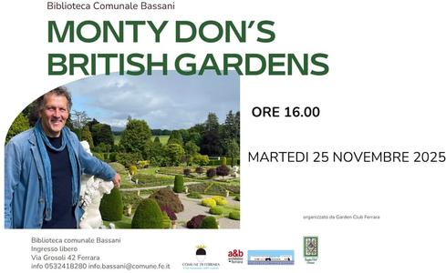 E' in programma per martedì 25 novembre 2025 alle 16:00 l'ultimo dei tre appuntamenti alla biblioteca comunale Bassani di via Grosoli 42 (Barco, Ferrara) alla scoperta dei giardini inglesi attraverso i documentari del giornalista britannico Monty Don.