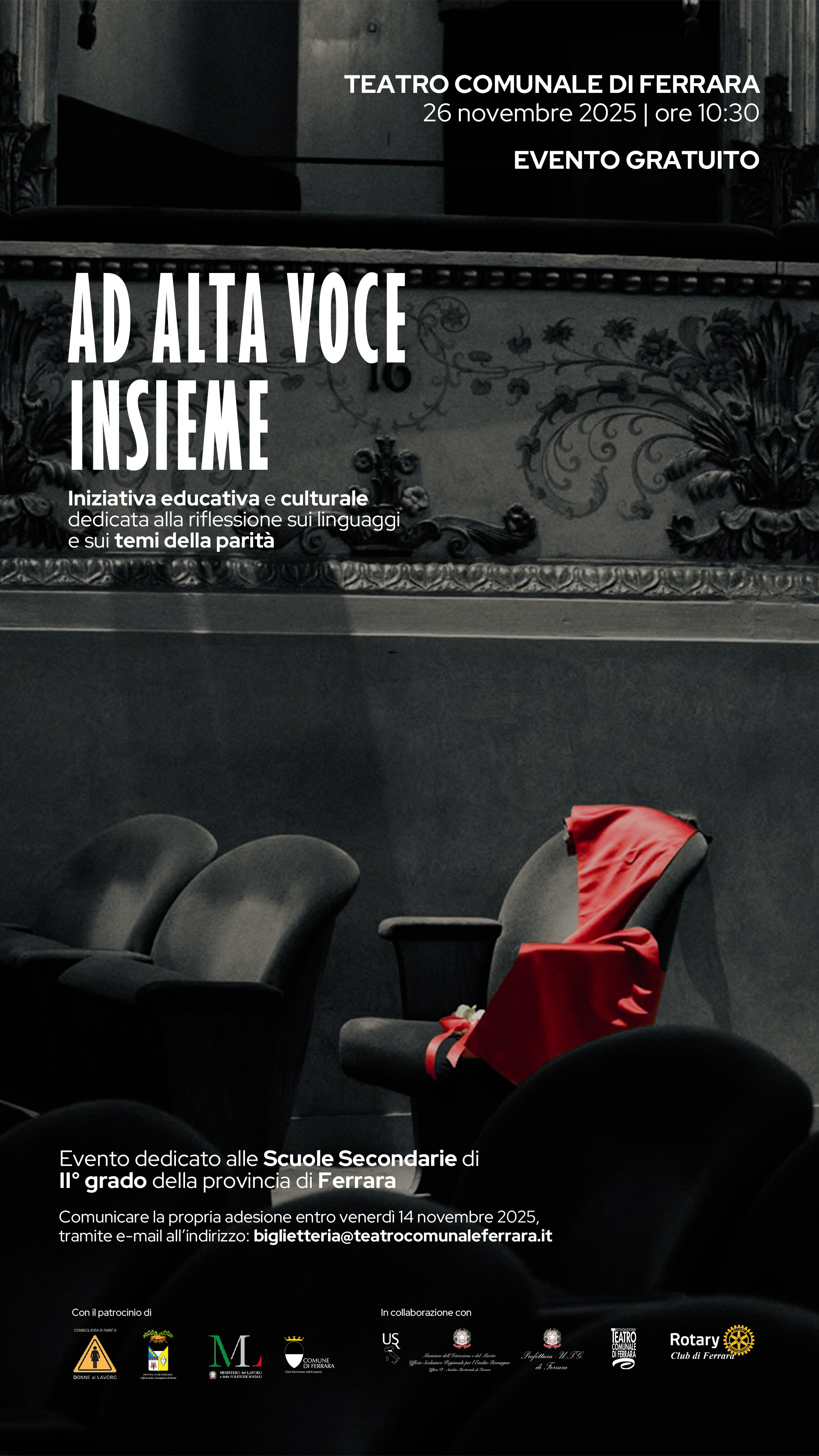 Il giorno successivo, mercoledì 26 novembre, il palcoscenico dell'Abbado accoglierà l'evento "Ad alta voce, insieme", momento centrale della due giorni e simbolo del dialogo tra istituzioni, scuola e comunità. L'iniziativa, patrocinata dal Comune di Ferrara e dalla Consigliera di Parità della Provincia di Ferrara, è promossa in collaborazione con la Prefettura di Ferrara, l'Ufficio Scolastico Regionale per l'Emilia-Romagna - Ambito territoriale di Ferrara, il Rotary Club di Ferrara e la Fondazione Teatro Comunale di Ferrara. Dedicato alle scuole secondarie di secondo grado del territorio provinciale e condotto da Chiara Bacilieri, l'evento rappresenta un'occasione di riflessione educativa e culturale sui linguaggi della parità e sul contrasto agli stereotipi di genere. Sul palco si esibiranno sei gruppi di studenti provenienti da diversi istituti superiori ferraresi, presentando le loro elaborazioni artistiche e performative. Tra le proposte, spiccano performance teatrali ispirate ai testi di Michela Murgia, brani musicali e corali originali, letture di poesie e fiabe, riflessioni collettive, video e azioni sceniche. Tutte queste espressioni mirano a evidenziare la consapevolezza dei giovani e la loro capacità di affrontare con sensibilità e creatività i temi della parità e del rispetto reciproco.
