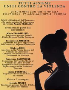 In apertura è previsto il saluto istituzionale dell'assessore alle Pari Opportunità del Comune di Ferrara Angela Travagli. Seguiranno gli interventi di Marta Evangelisti (presidente Gruppo FdI Regione Emilia Romagna), Francesca Lamberti (assessore Pari Opportunità del Comune di Vigarano Mainarda), Michela Bosi (Ispettore di Polizia Locale Comune di Crevalcore - Cofondatrice Ass. Volunteers Vs Violence), Francesca Caldarone (consigliere comunale FdI Comune di Cento, rappresentantoe provinciale del Dipartimento delle Vittime di violenza), Kevin Ponzuoli (segretario provinciale Cisl Fp di Ferrara), modera l'incontro Iolanda Madeo (presidente Gruppo consiliare FdI Comune di Ferrara).