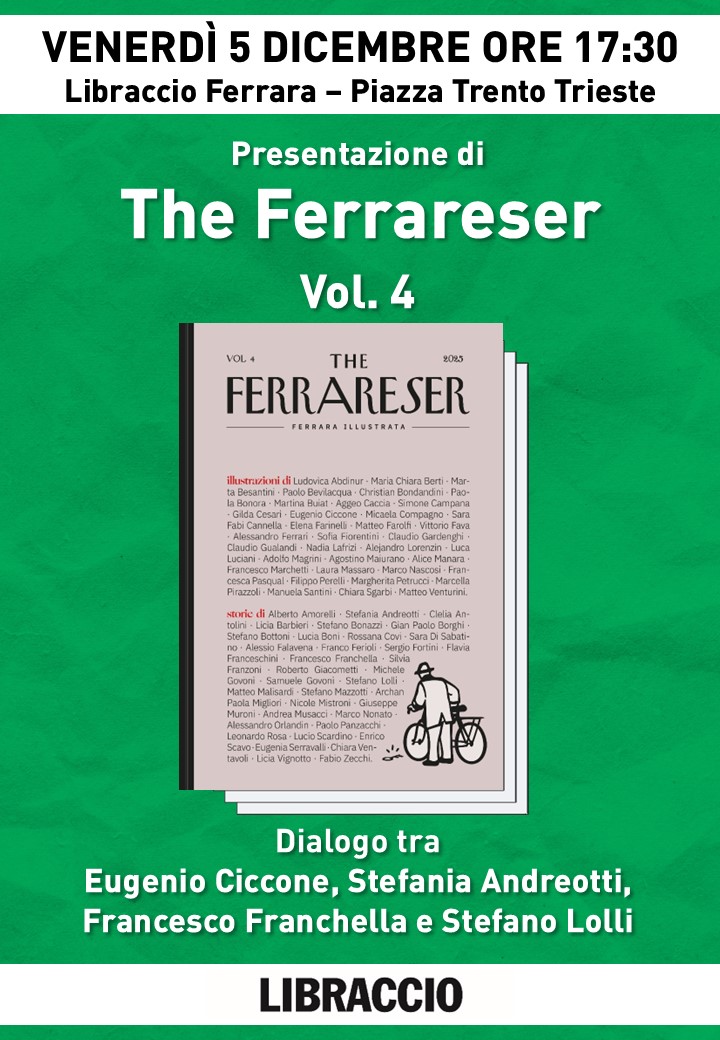 Il volume 4 è già disponibile in preordine dal sito theferrareser.com e sarà presentato in dettaglio alla Libreria Libraccio di Piazza Trento e Trieste a Ferrara, venerdì 5 dicembre alle 17.30, con alcuni degli autori tra cui Stefania Andreotti, Francesco Franchella, Stefano Lolli ed Eugenio Ciccone.