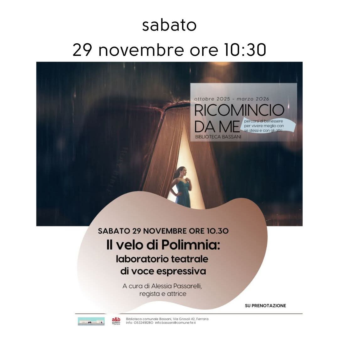 Si intitola "Il velo di Polimnia" il laboratorio teatrale di voce espressiva che si terrà sabato 29 novembre 2025 alle 9:30 alla biblioteca comunale Bassani (via Grosoli 42, Ferrara). L'incontro fa parte della rassegna "Ricomincio da me" e sarà a cura di Alessia Passarelli, regista e attrice con oltre vent'anni di esperienza nella conduzione di laboratori teatrali per adulti e bambini.