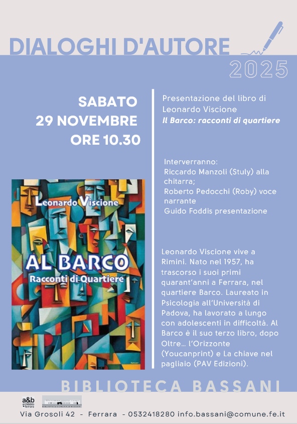 E' un mosaico affettivo e culturale il libro dal titolo "Al Barco. Racconti di quartiere" di Leonardo Viscione che sabato 29 novembre 2025 alle 10:30 sarà protagonista dell'appuntamento con "Dialoghi d'autore", alla biblioteca comunale Bassani (via Grosoli 42, Barco, Ferrara).