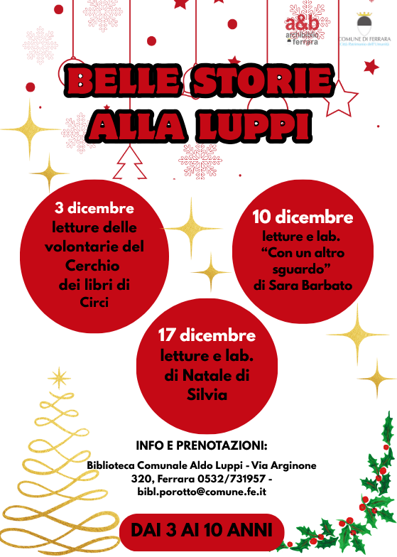 Saranno tutti dedicati al Natale gli appuntamenti del mese di dicembre con le "Belle Storie" per i più piccoli alla biblioteca comunale Luppi (via Arginone 320, Porotto). Il primo incontro è in programma per mercoledì 3 dicembre alle 17:00 con "Le emozioni della festa" letture animate a cura delle volontarie dell'associazione Circi-Cerchio di libri.