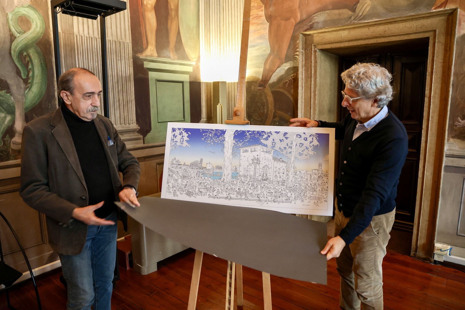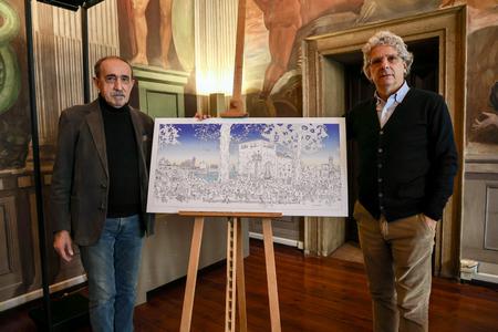 "L'autore dell'opera Claudio Gualandi - ha sottolineato l'assessore Gulinelli - è un maestro dell'illustrazione che rappresenta un elemento emblematico di Ferrara. La sua firma è diventata un grande marchio di qualità, capace di catturare l'essenza della città. Il suo lavoro è un patrimonio che continuerà a illuminare ed emozionare. Il disegno originale verrà esposto all'interno del monumento della Porta degli Angeli. Per consentire la riapertura pubblica dello spazio era necessario dotarlo di servizi igienci. Per questo il progetto di adeguamento prevede la realizzazione di una soluzione, che ha ottenuto i pareri sia del Ministero sia della Soprintendenza. Si tratta di uno dei luoghi più suggestivi e identitari. E questa illustrazione lo racconta coinvolgendo lo spettatore in un viaggio visivo, che necessita di tempo per approfondirne i particolari in maniera paragonabile a quella di lettura di un libro, allargandosi dal presente fino al passato della Ferrara rinascimentale, descritti con ironia, precisione e calore. Ne esce una Ferrara viva, restituita con cura e osservata con grande amore".