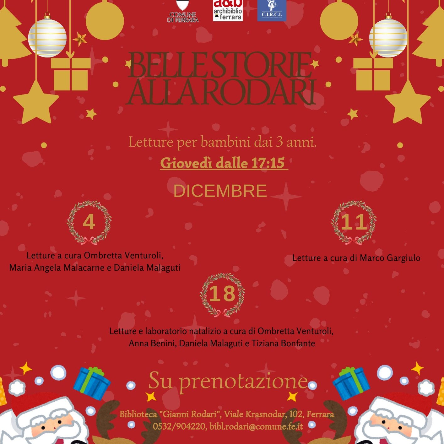 Ultimo appuntamento natalizio con le "Belle Storie" per i più piccoli alla biblioteca comunale Rodari di Ferrara (viale Krasnodar 102) giovedì 18 dicembre 2025 alle 17:15 . In compagnia di Ombretta Venturoli, Anna Benini, Daniela Malaguri e Tiziana Bonfante dell'Associazione CIRCI, bambine e bambini dai 3 anni potranno ascoltare tante storie dedicate al Natale, concluderà il pomeriggio un laboratorio a tema.