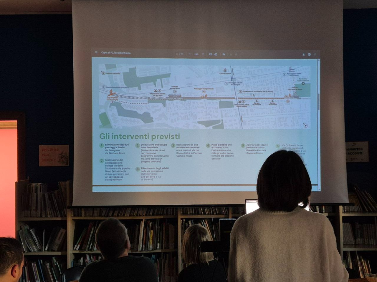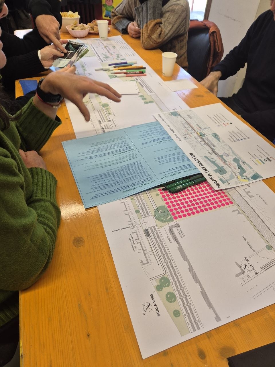 L'appuntamento si è aperto con una passeggiata esplorativa nell'area adiacente all'intervento, per permettere a cittadini ed esperti di osservare direttamente lo stato dell'estradosso e comprenderne potenzialità e limiti. Successivamente i partecipanti, suddivisi in tre gruppi misti, hanno lavorato sui principali temi emersi: verde e mitigazione del calore, sicurezza e socialità, gestione dei rifiuti, parcheggi e mobilità.