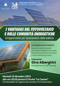 CER Ferrara, di cui il Comune è partner, avvia martedì 16 dicembre 2025 alle 20:30 nella sede del circolo "La Casona" in via Smeraldina 35 (ingresso da via Cesare Diana), un ciclo di incontri dedicato ai principali temi della transizione energetica: dal fotovoltaico per autoconsumo domestico e aziendale, all'agrivoltaico, alla mobilità elettrica, fino alle Comunità Energetiche Rinnovabili.