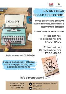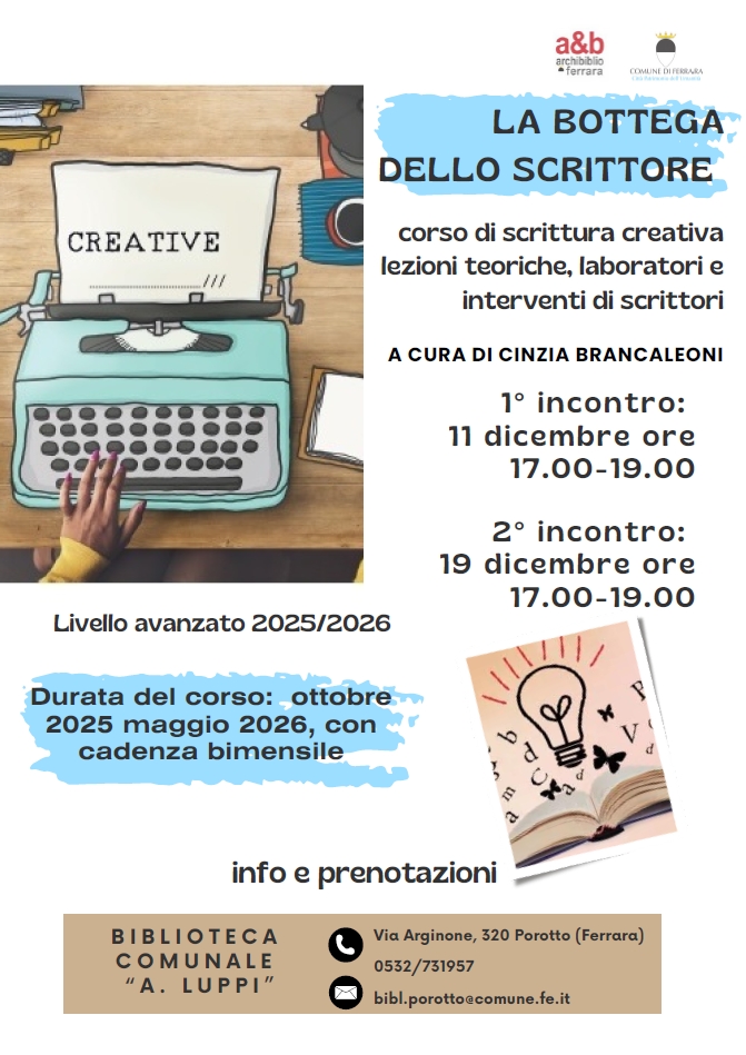 Proseguono, alla biblioteca comunale Aldo Luppi (via Arginone 320, Porotto), gli incontri de "La bottega dello scrittore", il corso di scrittura creativa a cura di Cinzia Brancaleoni. Due gli appuntamenti per questo mese: giovedì 11 dicembre 2025 alle 17:00 e venerdì 19 dicembre sempre alle 17:00.