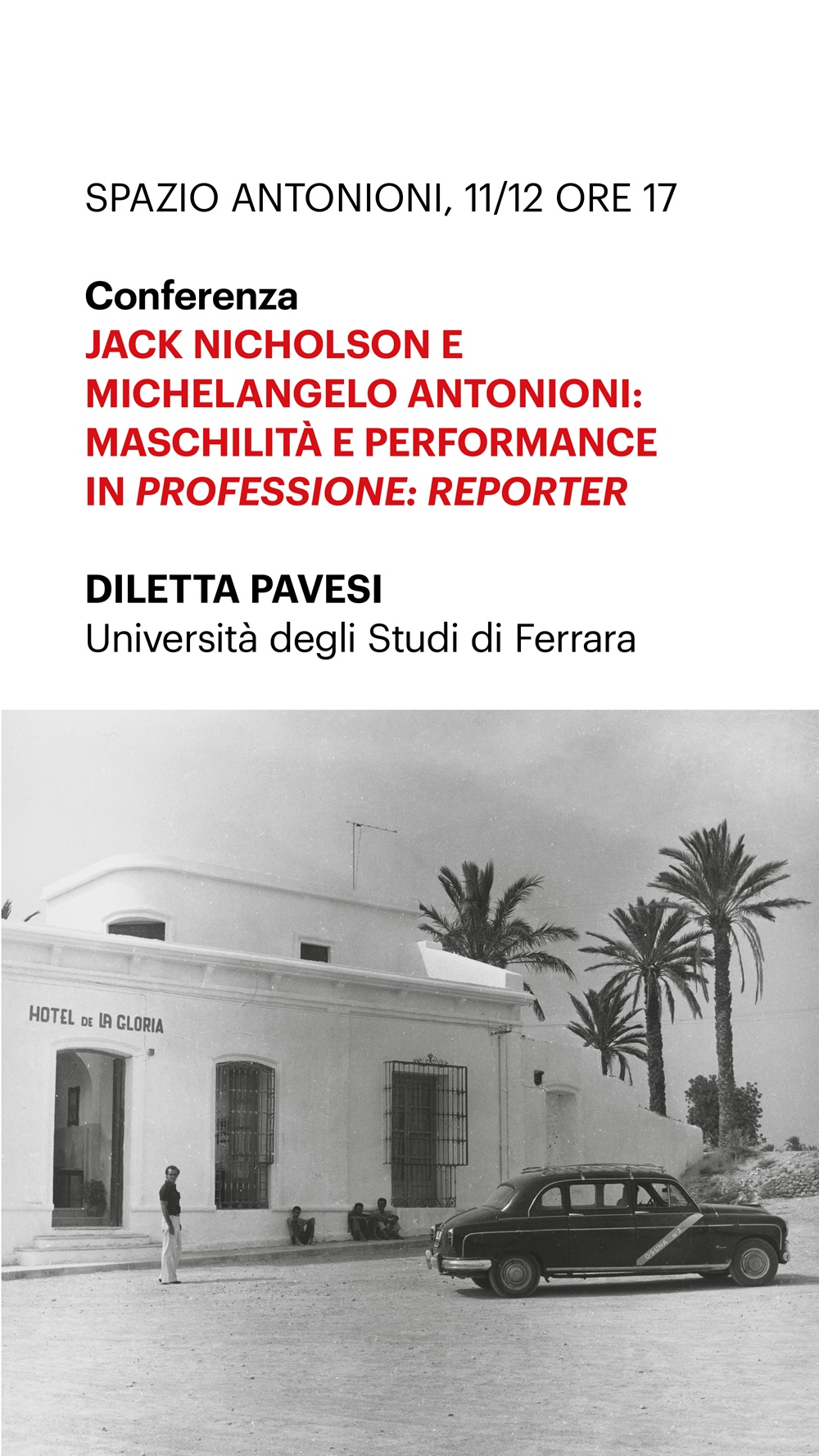 La penultima conferenza si terrà giovedì 11 dicembre 2025 alle 17:00 al primo piano dello Spazio Antonioni (corso Porta Mare 5). La relatrice sarà Diletta Pavesi (Università degli studi di Ferrara) con la conferenza "Jack Nicholson in 'Professione: reporter'. Attorialità e maschilità negli anni Settanta".