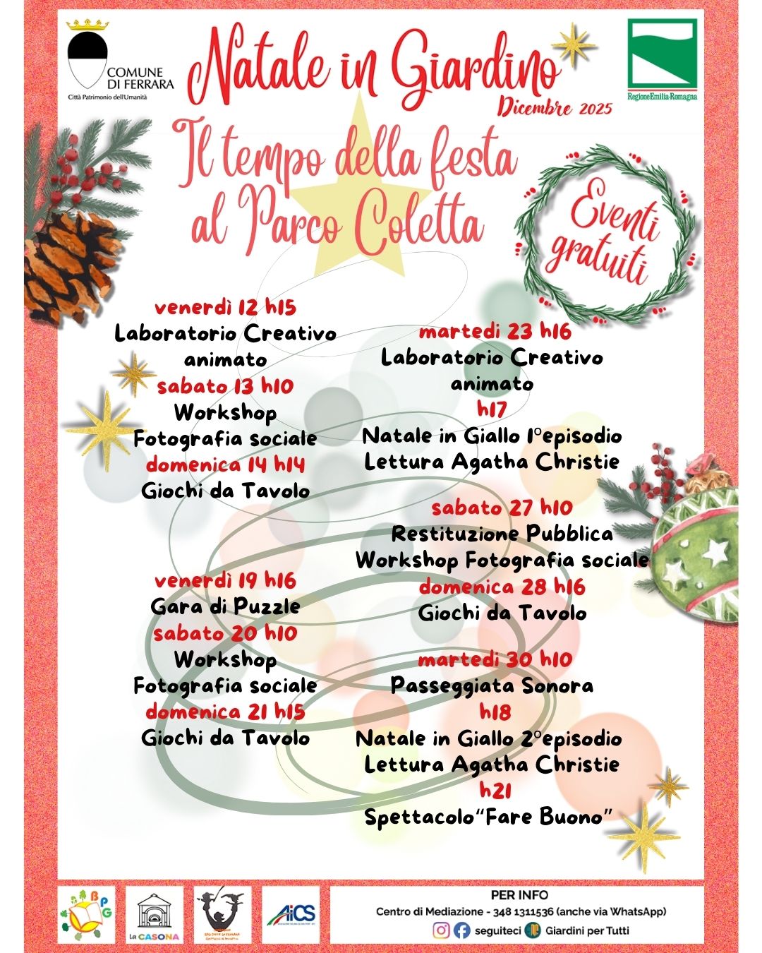 "Rafforzare il senso di comunità all'interno del quartiere Giardino". Parte da qui "Il tempo della Festa", iniziativa promossa da Biblioteca Popolare Giardino insieme a Cumbre aps, Ludus aps e Pangea aps. "Il tempo della festa" si inserisce si inserisce all'interno di "Natale in Giardino", iniziativa che conta oltre 50 attività tra il 12 e il 30 dicembre 2025 e promossa dal Comune di Ferrara, in collaborazione con la Regione Emilia-Romagna e curata da: La Casona, Biblioteca Popolare Giardino, Compagnia Gad Città di Ferrara e Aics. Tredici interventi si inseriscono nella progettualità curata da Biblioteca Popolare Giardino.