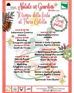 A proporre giochi da tavolo cooperativi sarà anche Pangea aps che domenica 21 dicembre propone un'occasione "per mettere in gioco collaborazione, empatia e un po' di strategia, ma soprattutto per capire che non esiste soltanto la competizione". Un'altra occasione per giocare insieme sarà la gara di puzzle, una competizione amichevole aperta a squadre miste per età e provenienza, che ha l'obiettivo di favorire la collaborazione e la comunicazione tra i partecipanti. "Sono due laboratori nati per stimolare la fantasia dei partecipanti e offrire un punto di vista personale del mondo e delle sue storie" quelli proposti da Lisa Boni di Cumbre aps. Prendono spunto dalla lettura de "Il pianeta degli alberi di Natale" di G.Rodari: il primo inaugurerà le attività della rassegna Natale in Giardino al parco Coletta il pomeriggio del 12 dicembre, mentre il secondo arriverà proprio il giorno prima della vigilia di Natale, il 23 dicembre.