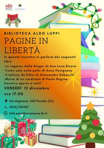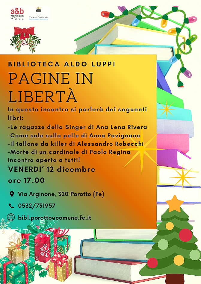 E' in programma per venerdì 12 dicembre 2025 alle 17:00 il nuovo appuntamento del gruppo di lettura "Pagine in Libertà" alla biblioteca comunale Aldo Luppi (via Arginone 320, Porotto).