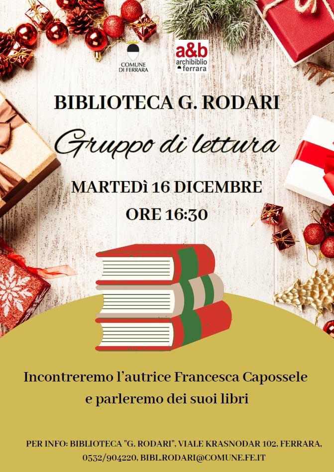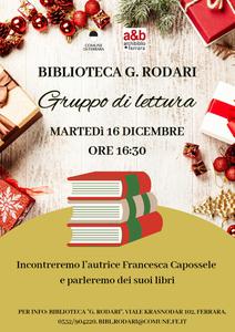 Sarà l'autrice ferrarese Francesca Capossele l'ospite del nuovo incontro del gruppo di lettura della biblioteca comunale Rodari in calendario per martedì 16 dicembre 2025 alle 16:30 nella sede di viale Krasnodar 102, a Ferrara.