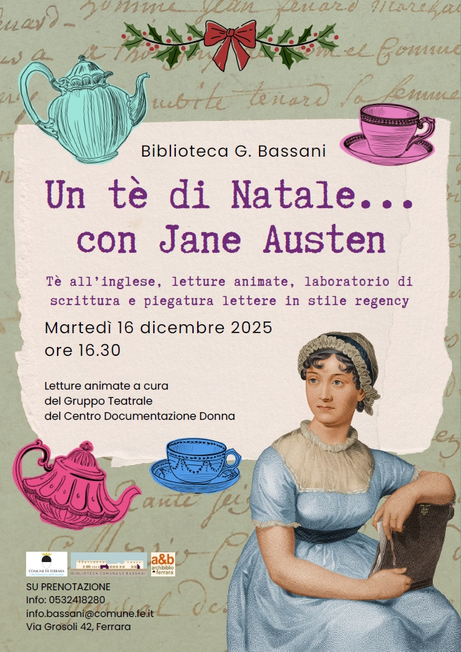 Un pomeriggio elegante e profumato di tè e di storie, per celebrare Jane Austen e il Natale con grazia inglese. L'appuntamento è per martedì 16 dicembre 2025 alle 16:30 alla biblioteca comunale Bassani in via Grosoli 42 (Barco, Ferrara), in occasione dei 250 anni dalla nascita della scrittrice inglese.