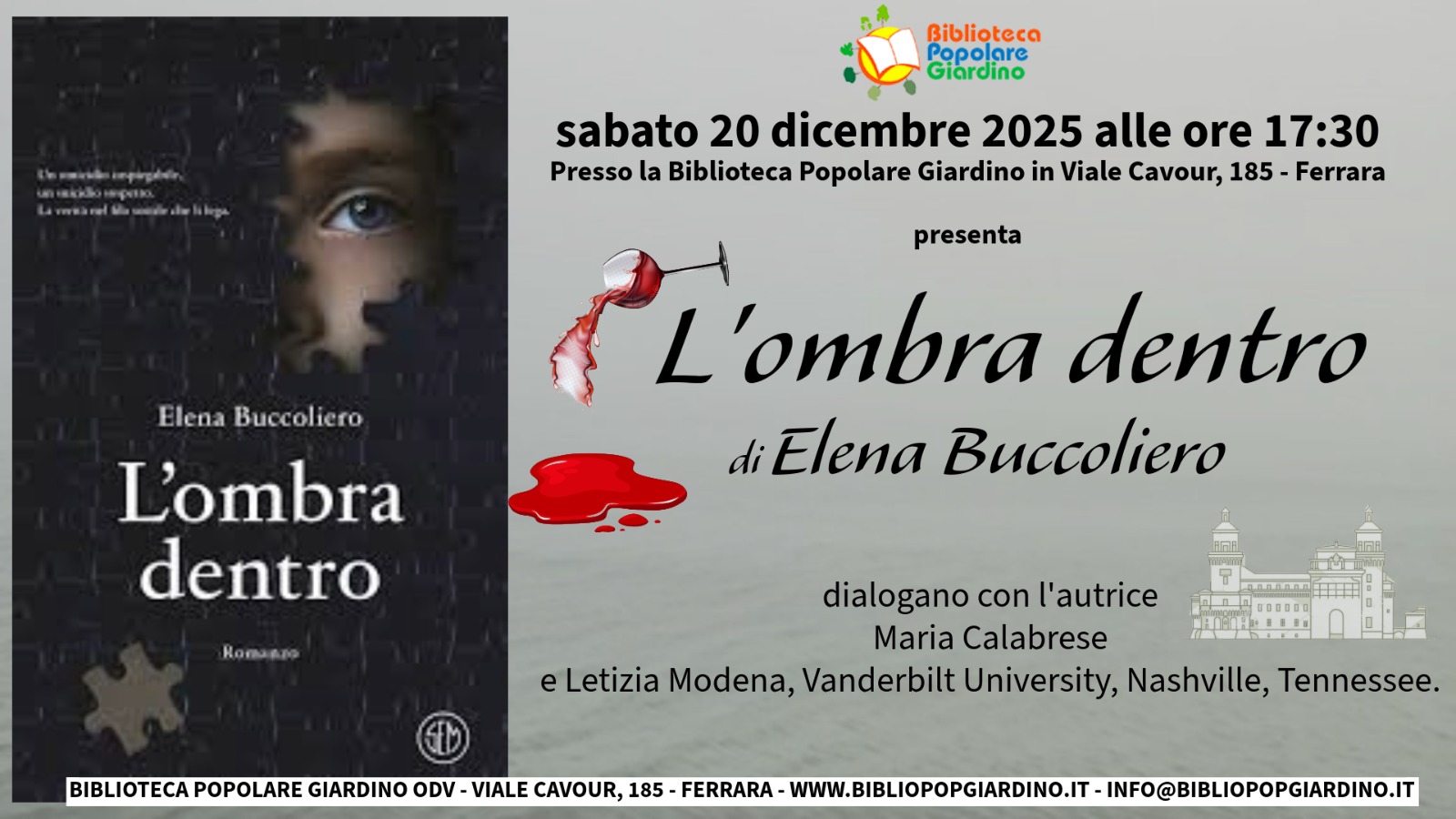 La Biblioteca Popolare Giardino ha organizzato per sabato 20 dicembre 2025 ore 17:30 nella sede di viale Cavour 185 (alla base del Grattacielo) la presentazione del libro "L'ombra dentro" (ediz. SEM) di Elena Buccoliero. Dialogheranno con l'autrice Maria Calabrese della Biblioteca Popolare Giardino e Letizia Modena, Vanderbilt University, Nashville, Tennessee