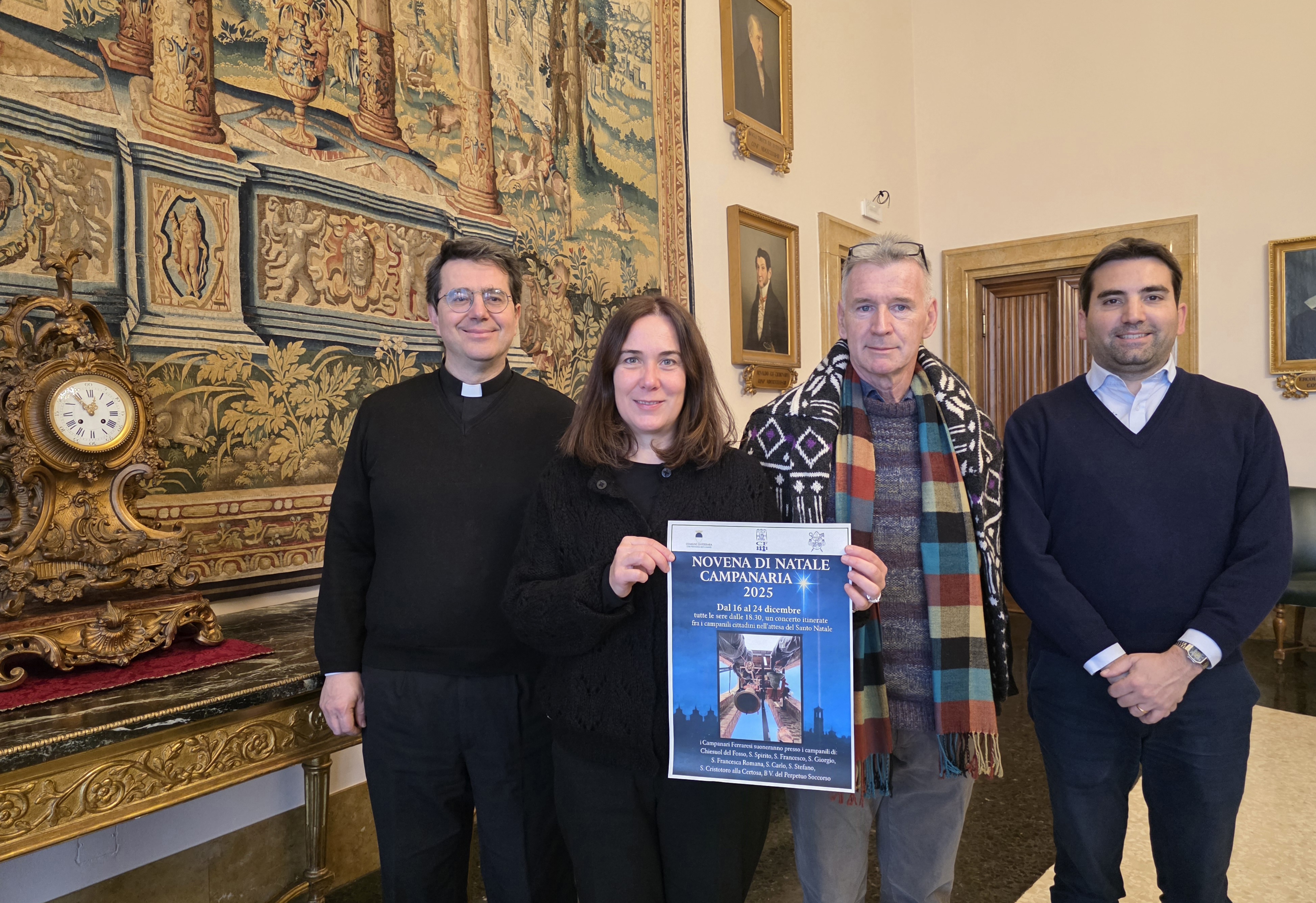 Nella foto, da sinistra: don Paolo Galeazzi (responsabile "Musica Sacra" della commissione per la musica sacra dell'Arcidiocesi di Ferrara-Comacchio); assessore Cristina Coletti; Giovanni Vecchi (presidente dell'Associazione Campanari Ferraresi); Francesco Buttino (segretario dell'Associazione Campanari Ferraresi).