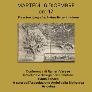 Sarà dedicata alla figura e alle opere dell'incisore ferrarese Andrea Bolzoni la conferenza di Ranieri Varese in programma martedì 16 dicembre 2025 alle 17 nella sala Agnelli della biblioteca comunale Ariostea (via Scienze 17, Ferrara).