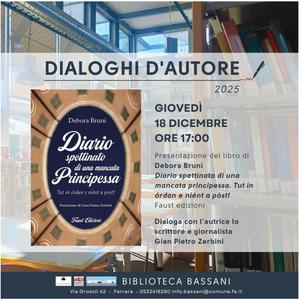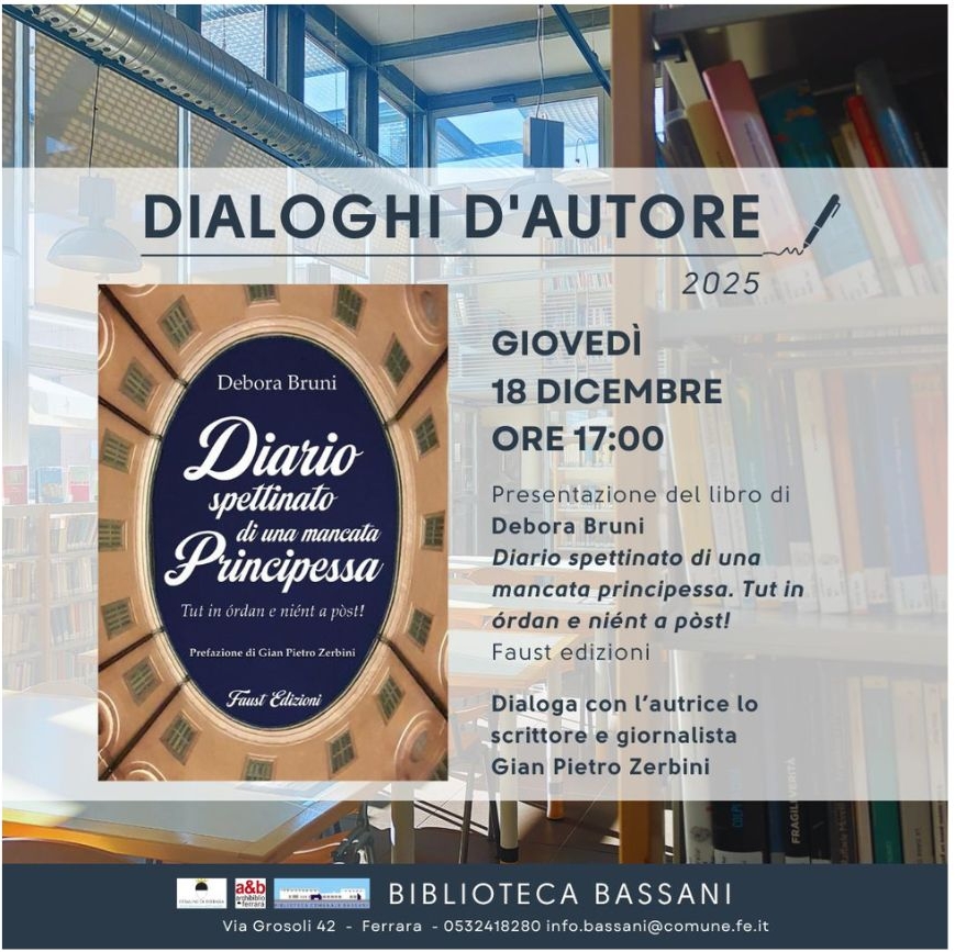 E' un racconto autoironico di vita vissuta quello contenuto nel libro di Debora Bruni dal titolo "Diario spettinato di una mancata principessa. Tut in órdan e niént a pòst!" che giovedì 18 dicembre 2025 alle 17:00 sarà protagonista dell'appuntamento con "Dialoghi d'autore", alla biblioteca comunale Bassani (via Grosoli 42, Barco, Ferrara).