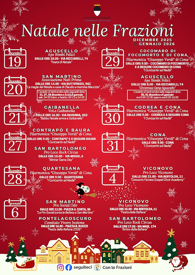 Concerti sulle note della tradizione, incontri con Babbo Natale, giochi, l'arrivo della Befana. Un Natale diffuso, che unisce tutto il territorio grazie al coinvolgimento di una decina di associazioni e che per la prima volta, quest'anno, vede una propria rassegna di eventi dedicata, "Natale nelle Frazioni", promossa con il patrocinio dell'Assessorato alle Frazioni del Comune di Ferrara. Dal prossimo fine settimana fino all'Epifania, i centri abitati del forese che ospiteranno le iniziative sono 13, a garanzia di un clima di festa che scalda tutto il territorio comunale. Dopo l'accensione delle luci e degli alberi, i primi eventi inizieranno da venerdì 19 dicembre, ad Aguscello.