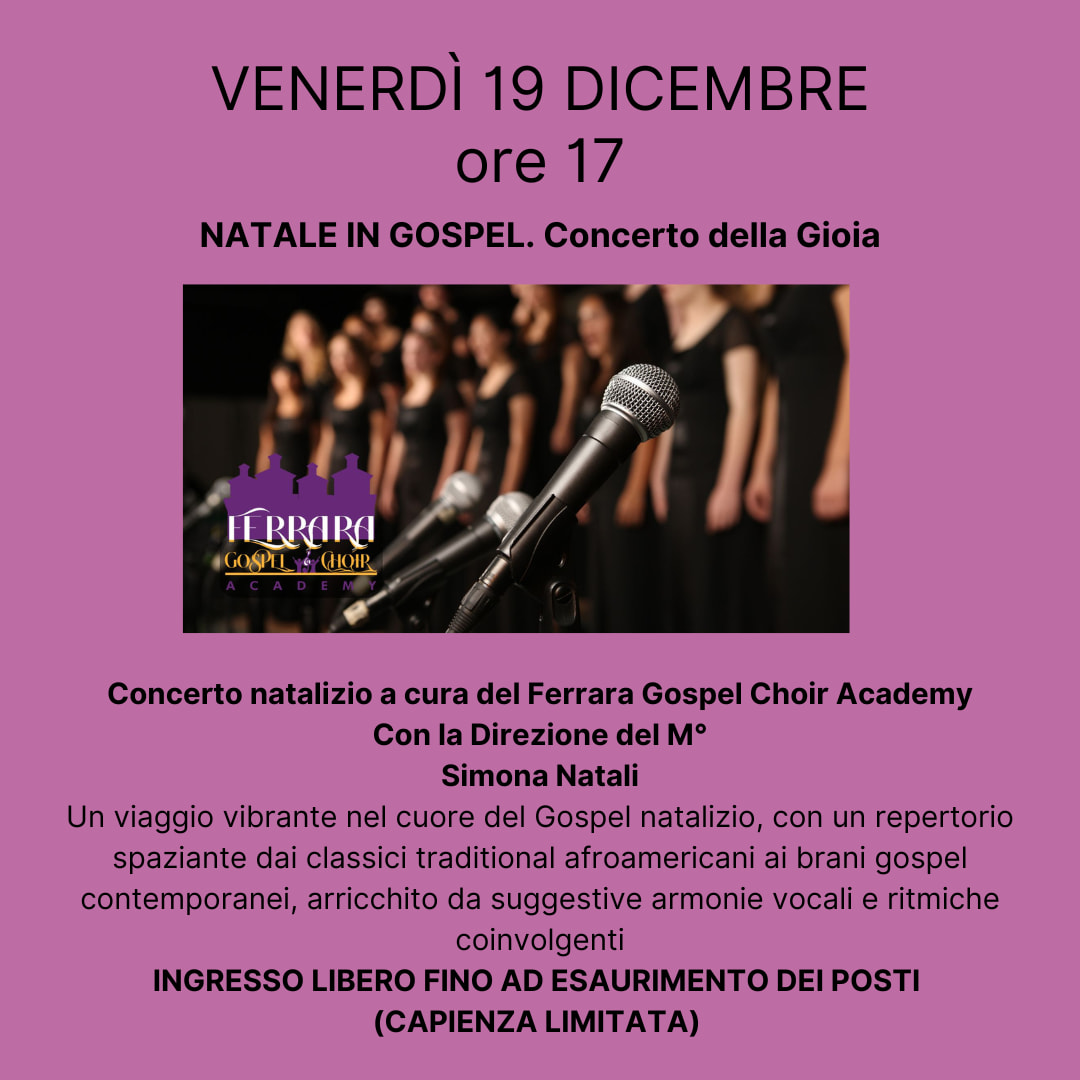 Un viaggio vibrante nel cuore del Gospel natalizio: è il "Concerto della Gioia" con cui venerdì 19 dicembre 2025 alle 17:00 la Ferrara Gospel Choir Academy animerà la sala Agnelli della biblioteca comunale Ariostea (via Scienze 17 Ferrara). A dirigere il coro sarà il M° Simona Natali.