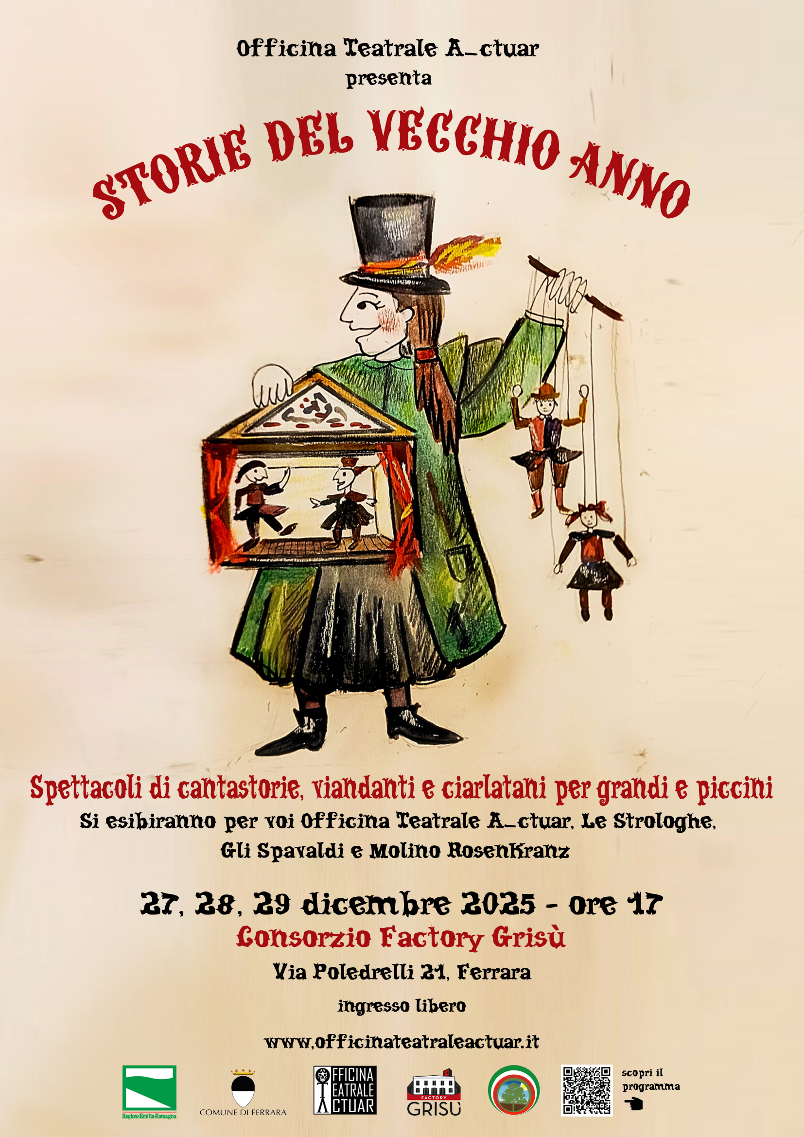 "Storie del vecchio anno" è il titolo della rassegna di spettacoli e narrazioni dedicata all'antica arte di cantastorie e ciarlatani, in programma a Ferrara da sabato 27 a lunedì 29 dicembre 2025 alle 17:00 al Consorzio Factory Grisù (via Poledrelli 21, Ferrara).