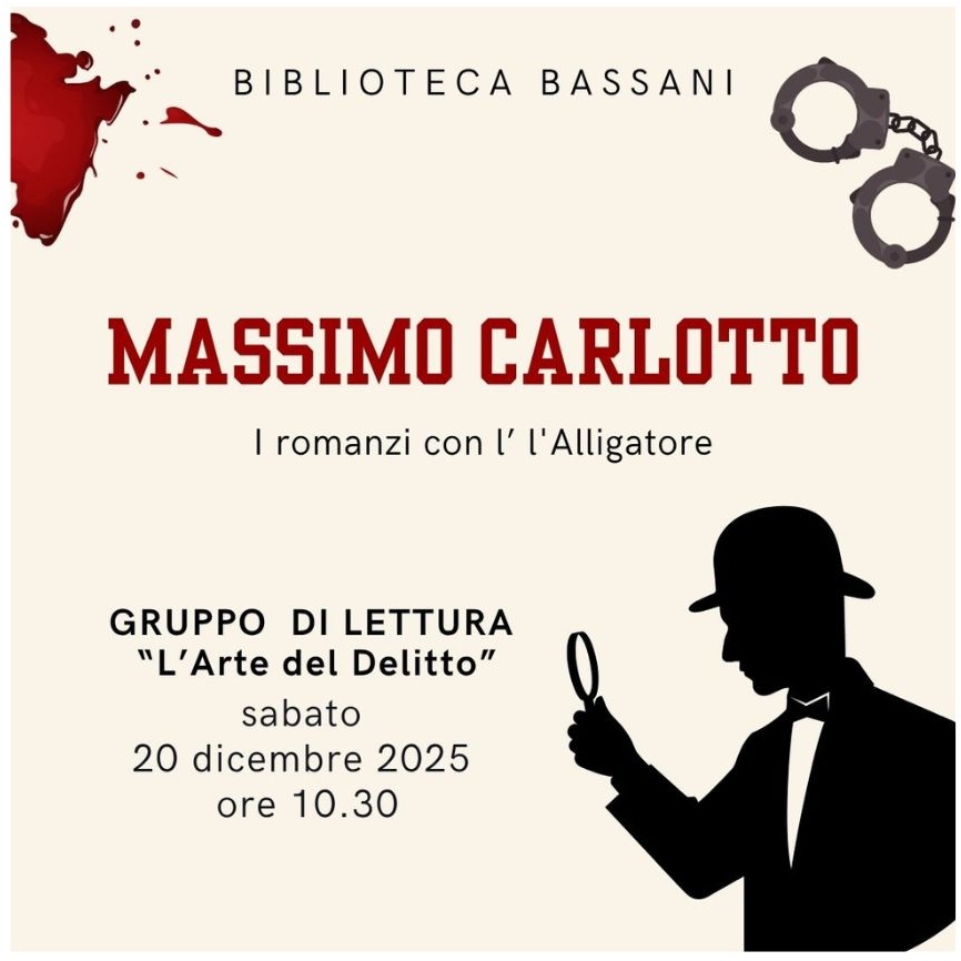 Sarà dedicato ai romanzi di Massimo Carlotto, con l’investigatore l'Alligatore, l'incontro del gruppo di lettura "L'arte del delitto", in programma sabato 20 dicembre 2025 alle 10:30, alla biblioteca comunale Bassani (via G. Grosoli 42, Barco - Ferrara).