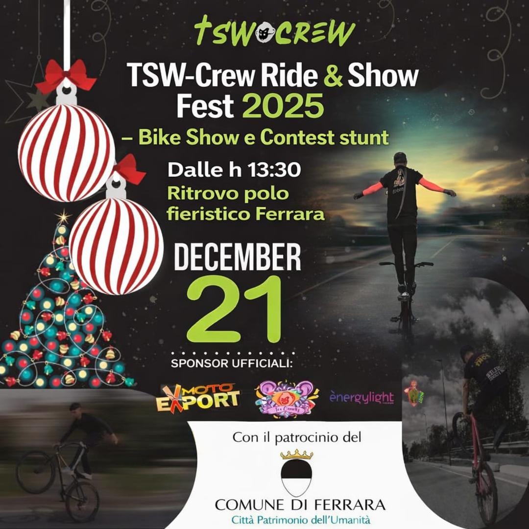 Una giornata dedicata al mondo della bici stunt e dell'urban riding, con esibizioni sportive, contest aperti agli atleti e momenti di intrattenimento per il pubblico. L'appuntamento è per domenica 21 dicembre 2025 dalle 13:30 nella zona esterna del Polo fieristico di Ferrara (ritrovo in piazzale stazione ore 15, corteo di biciclette verso quartiere Fiera di Ferrara), con l'evento "TSW-Crew Ride & Show Fest 2025 - Bike Show e Contest Stunt", organizzato da TSW-Crew asd, con il patrocinio del Comune di Ferrara.