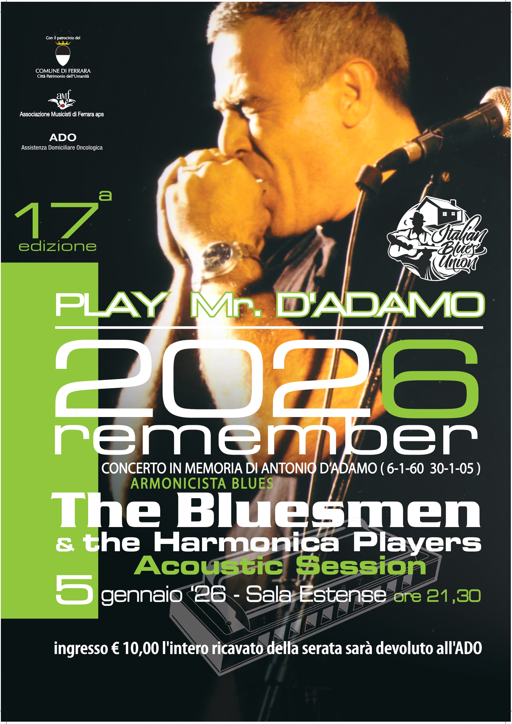Il concerto, organizzato dall'Associazione Musicisti di Ferrara Aps (Amf) in collaborazione con Fondazione Ado, è patrocinato dall'Assessorato alle Politiche Sociosanitarie del Comune di Ferrara e vedrà l'esibizione della storica formazione, 'The Bluesmen', di cui D'Adamo era uno dei pilastri. Per lui, e per offrire ai cittadini ferraresi uno spettacolo di altissima qualità, si alterneranno sul palco 13 armonicisti provenienti da tutta l'Emilia-Romagna.