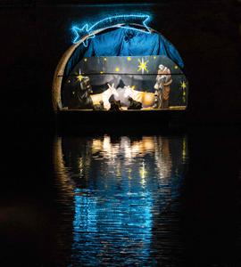 Un rito carico di significato che unisce spiritualità, tradizione e spettacolo, accompagnato da giochi di luce, riflessi sull'acqua e melodie natalizie che rendono l'atmosfera ancora più intensa e raccolta.