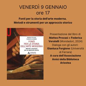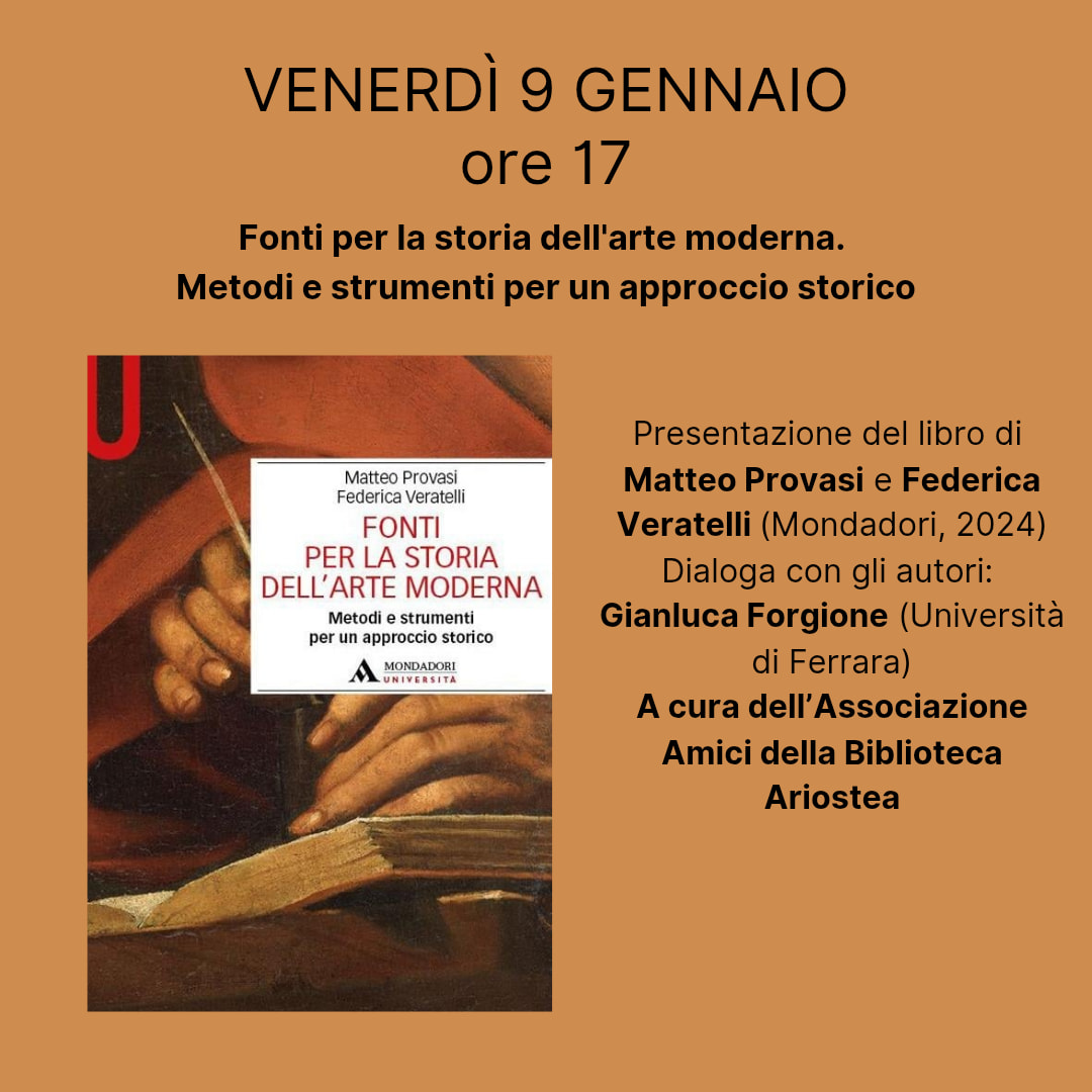 Esplora le potenzialità di un approccio alla storia dell'arte basato sull'analisi di nuovi tipi di documenti il libro di Matteo Provasi e Federica Veratelli (Mondadori, 2024) dal titolo "Fonti per la storia dell'arte moderna" che venerdì 9 gennaio 2026, alle 17:00, sarà presentato nella sala Agnelli della biblioteca comunale Ariostea (via Scienze 17, Ferrara).