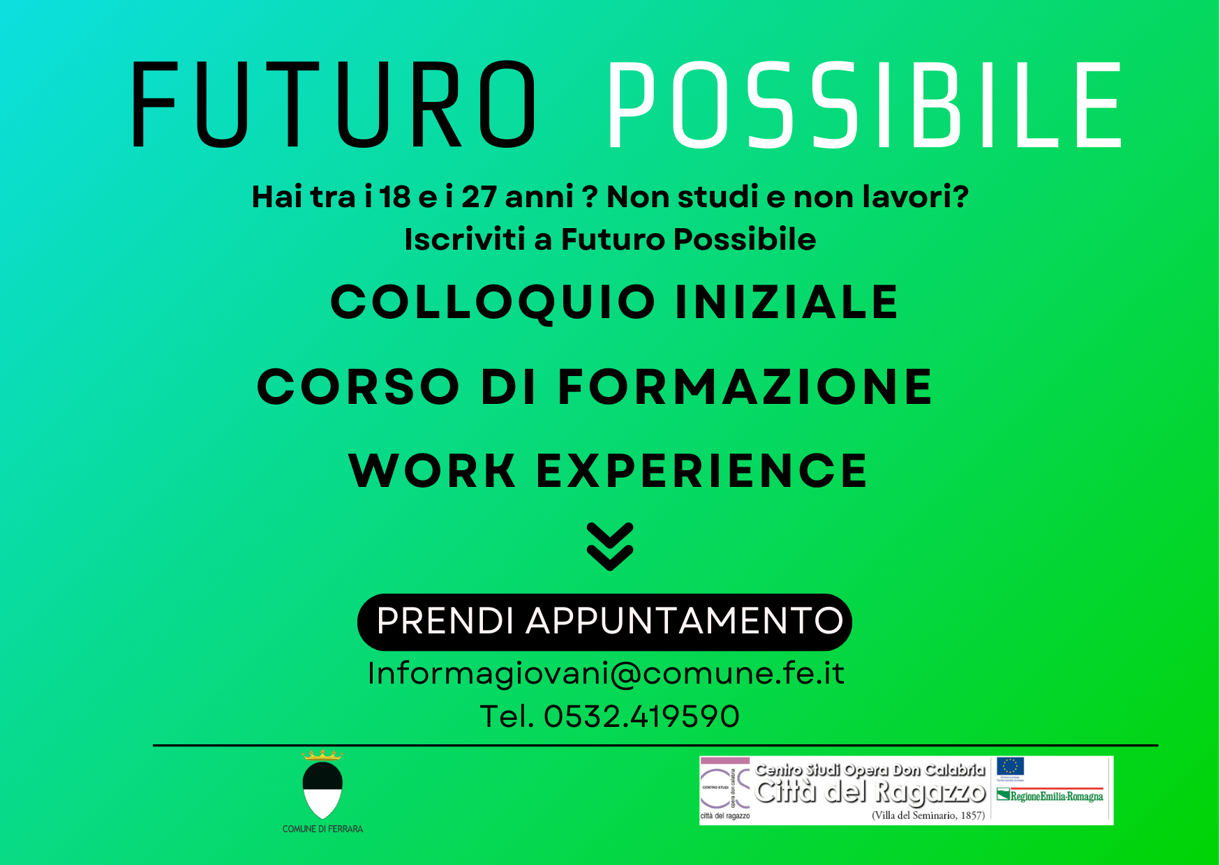L'obiettivo del progetto è chiaro: riavvicinare i giovani alla ricerca attiva del lavoro, restituendo motivazione, fiducia e strumenti utili per rientrare nei circuiti formativi e occupazionali. 'Futuro Possibile' è promosso dall'Assessorato alle Politiche Giovanili (U.O. Nuove Generazioni) del Comune di Ferrara, con l'operatività affidata a Informagiovani, in collaborazione con il Centro Studi Opera Don Calabria - Città del Ragazzo, ed è finanziato attraverso il Piano per il benessere sociale e sanitario del Distretto Centro Nord.