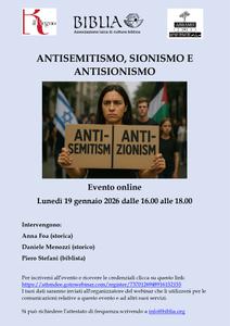 Lunedì 19 gennaio 2026 dalle 16:00 alle 18:00 si terrà un'incontro online dal titolo "Antisemitismo, sionismo e antisionismo". L'iniziativa è organizzata dalla rivista "Il Regno", dall'associazione laica di cultura biblica "Biblia" e dall'associazione "Abramo Pace".