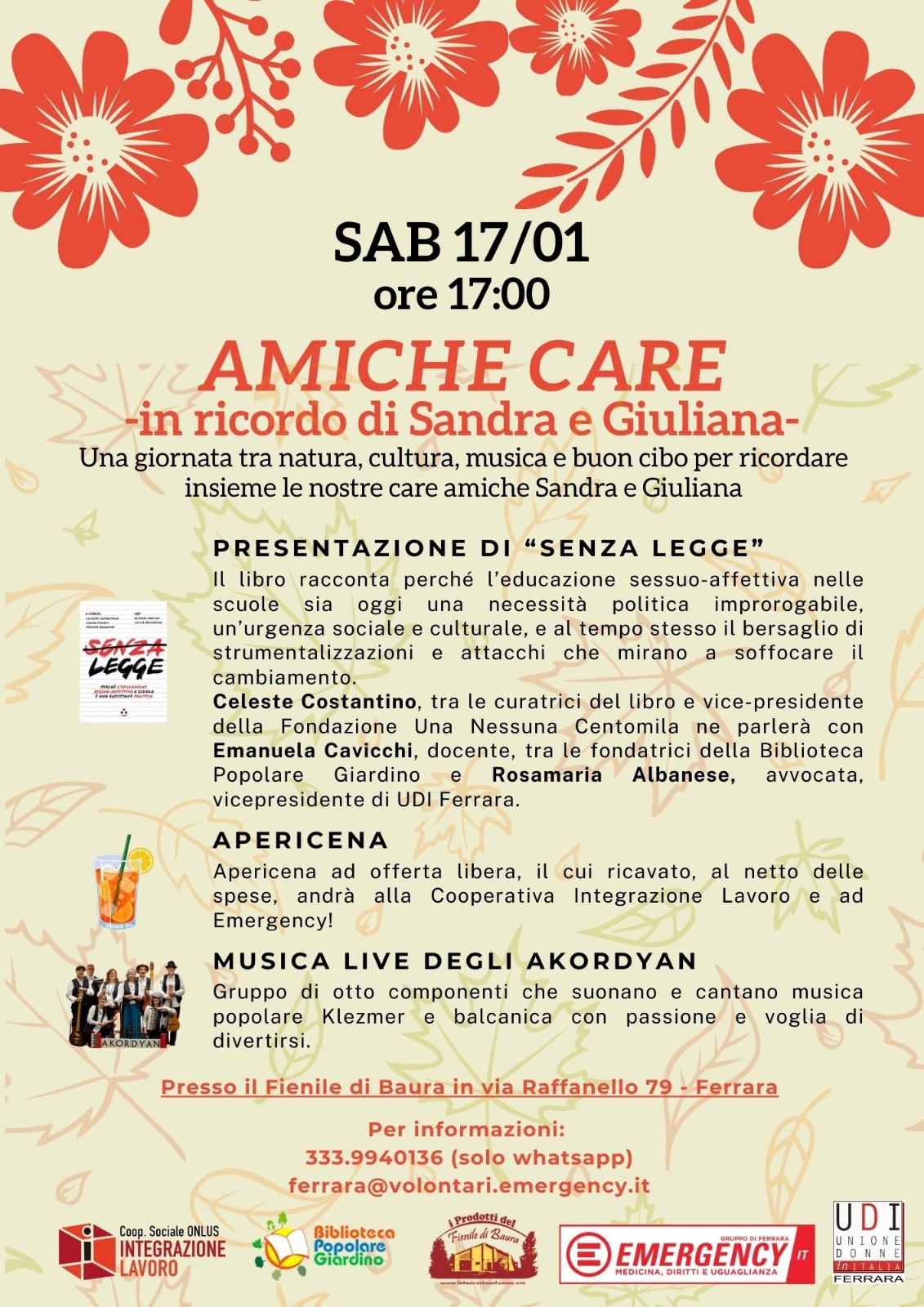 Una giornata tra natura, cultura, musica e buon cibo per ricordare Sandra e Giuliana. Biblioteca Popolare Giardino, Emergency, Coop Integrazione Lavoro, il Fienile di Baura e UDI invitano all'evento in ricordo di Sandra e Giuliana, due amiche care il cui impegno e la cui passione hanno lasciato un segno tangibile.