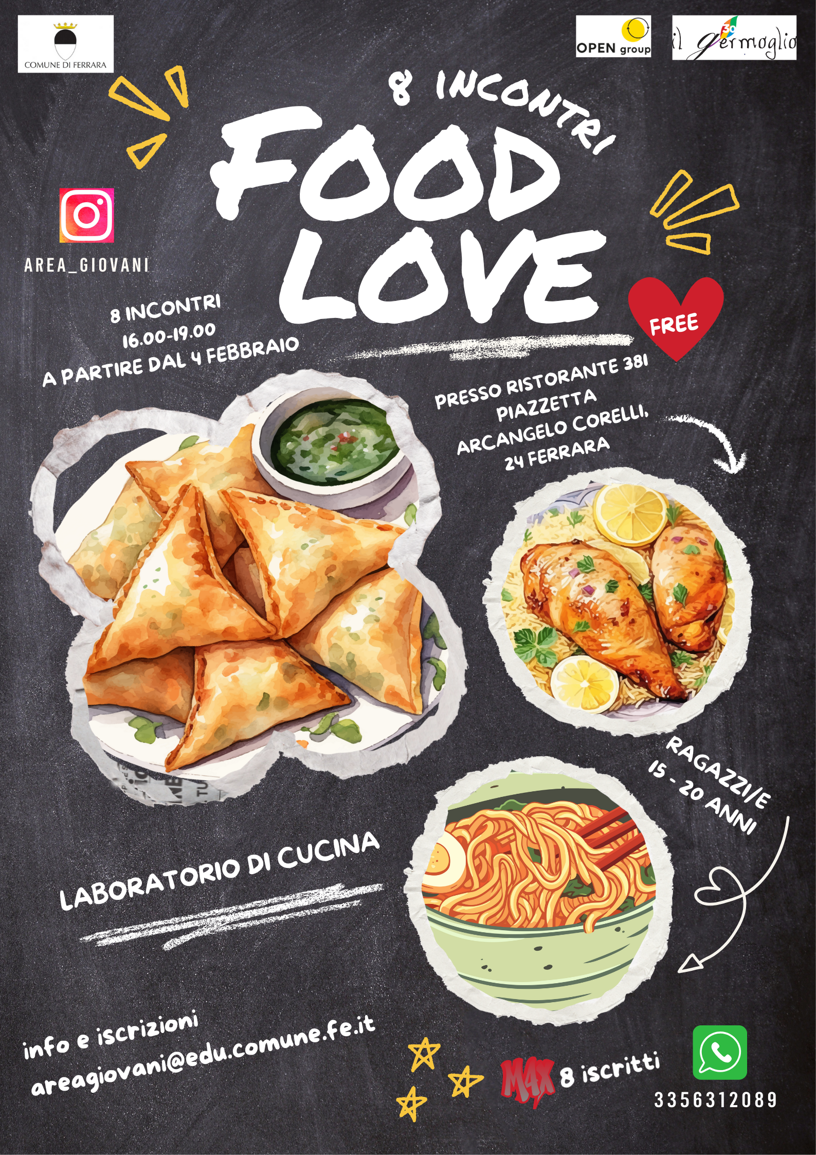 A completare il programma sarà il Laboratorio di Cucina - Food Love, ospitato al Ristorante 381 in piazzetta Corelli. Il percorso, rivolto a ragazze e ragazzi tra i 15 e i 20 anni, partirà il 4 febbraio 2026 e prevede 8 incontri, tutti i mercoledì dalle 16:00 alle 19:00, con un massimo di otto partecipanti.