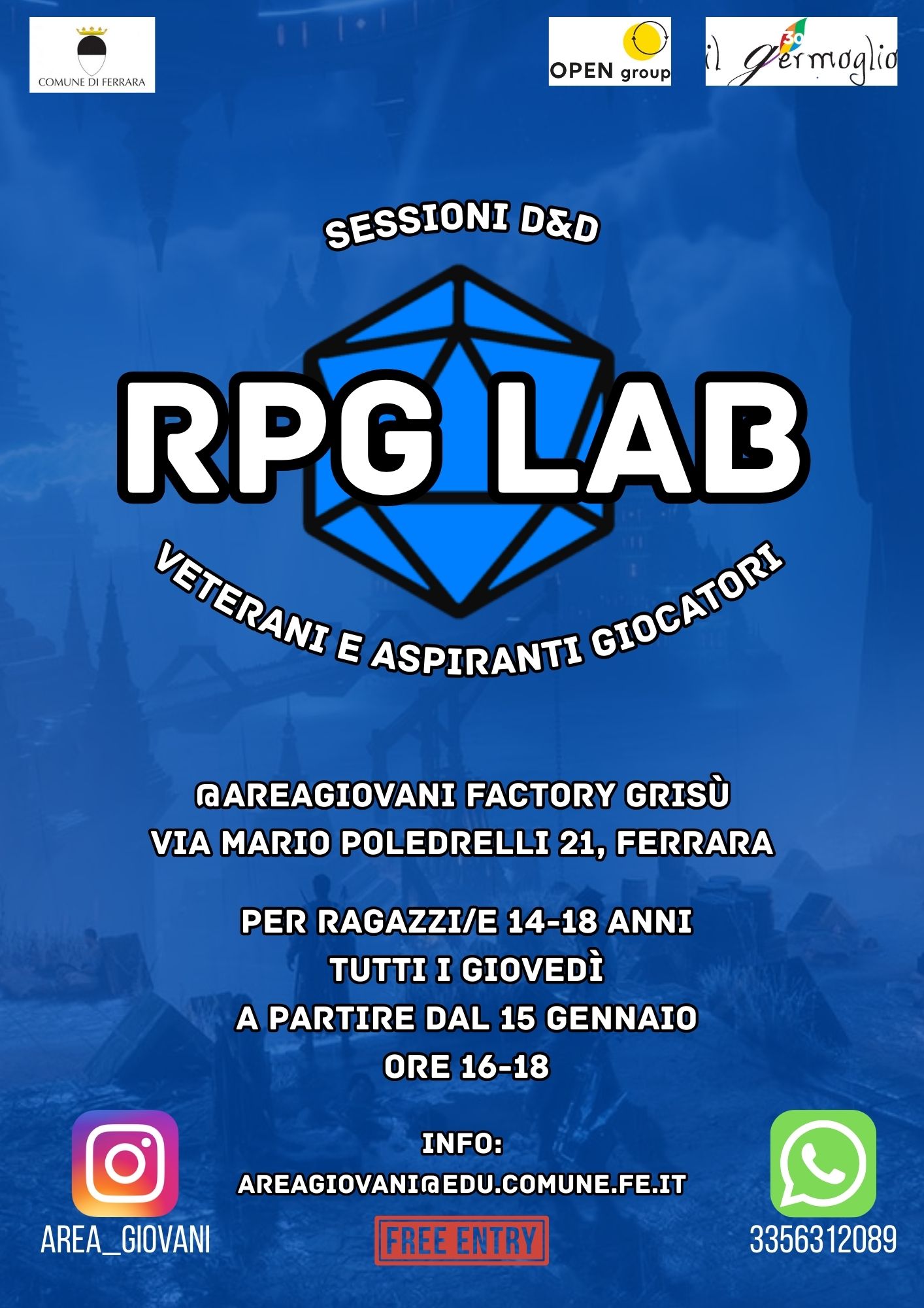Giovedì 15 gennaio 2026 prenderà il via RPG Lab, uno spazio dedicato ai giochi di ruolo - in particolare Dungeon&Dragons - nato su proposta di quattro ragazzi che frequentano abitualmente Area Giovani e che condurranno il laboratorio. Gli incontri saranno ogni giovedì dalle 16:00 alle 18:00, per giovani dai 14 ai 18 anni.