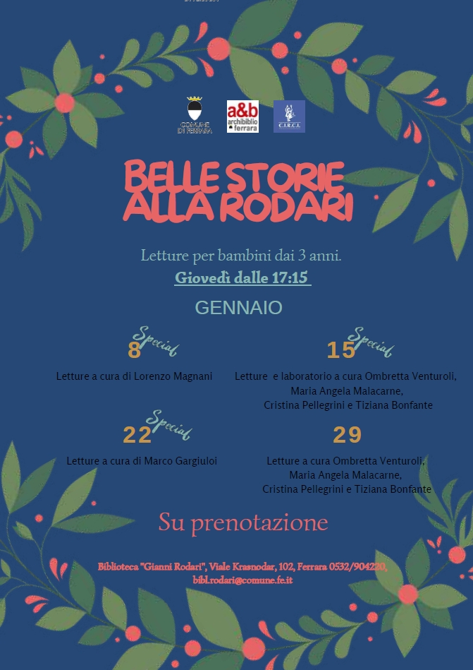 ►Il programma completo degli appuntamenti culturali alla biblioteca Rodari e nelle altre biblioteche comunali di Ferrara alla pagina: https://archibiblio.comune.ferrara.it