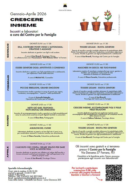 Un calendario di incontri ricco e trasversale, che propone spazi di riflessione, dialogo, laboratori e tante altre attività pensate per sostenere le famiglie nelle diverse fasi della crescita di bambini, preadolescenti e adolescenti. Giovedì 22 gennaio 2026 alle 17:30 partirà a Ferrara il primo degli 11 appuntamenti gratuiti promossi a cadenza settimanale - ogni giovedì fino al 9 aprile 2026 - dall'Assessorato alle Politiche per la Famiglia del Comune di Ferrara con l'intento di accompagnare genitori e nonni nelle sfide quotidiane, che richiedono di essere affrontate con consapevolezza e con strumenti adeguati. Le attività, che si terranno tutte al Centro per le Famiglie di via Darsena, 57, rientrano nel programma "Crescere insieme".