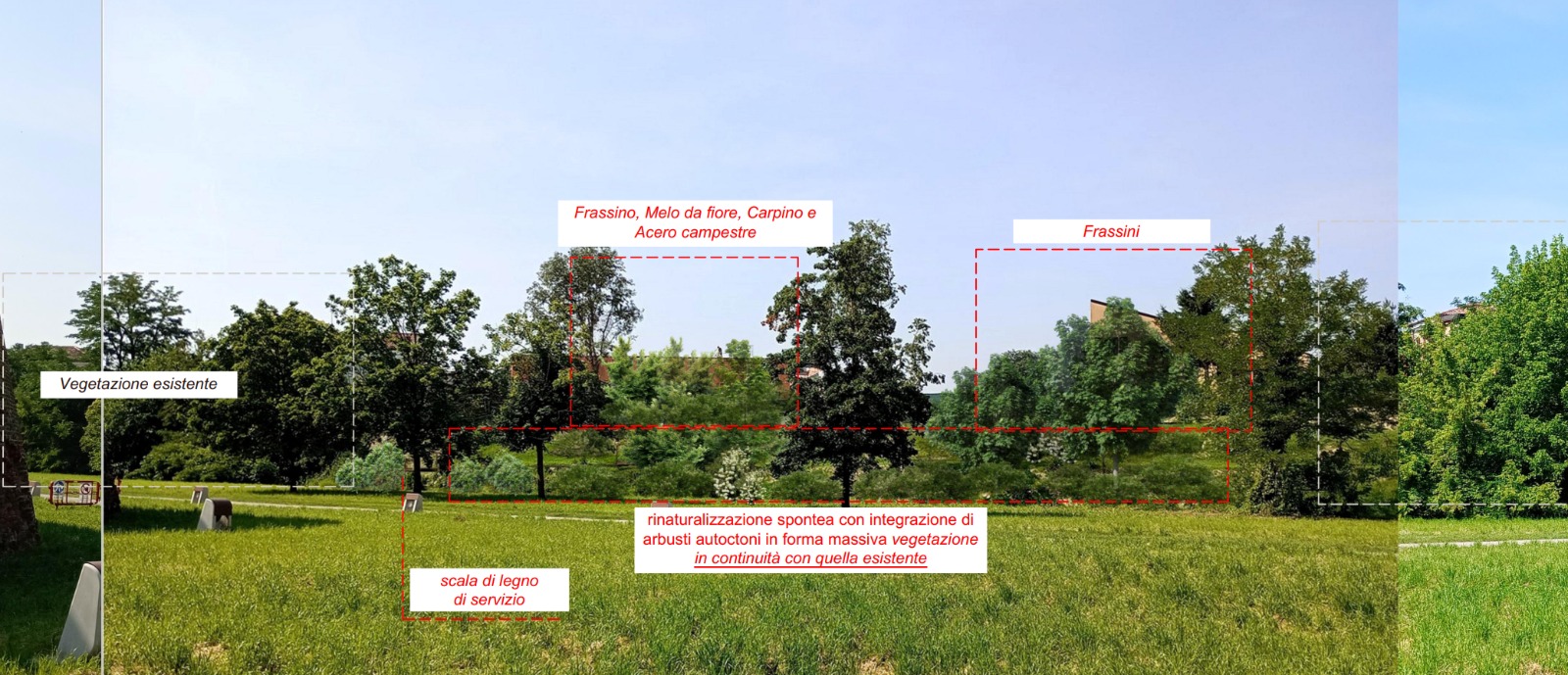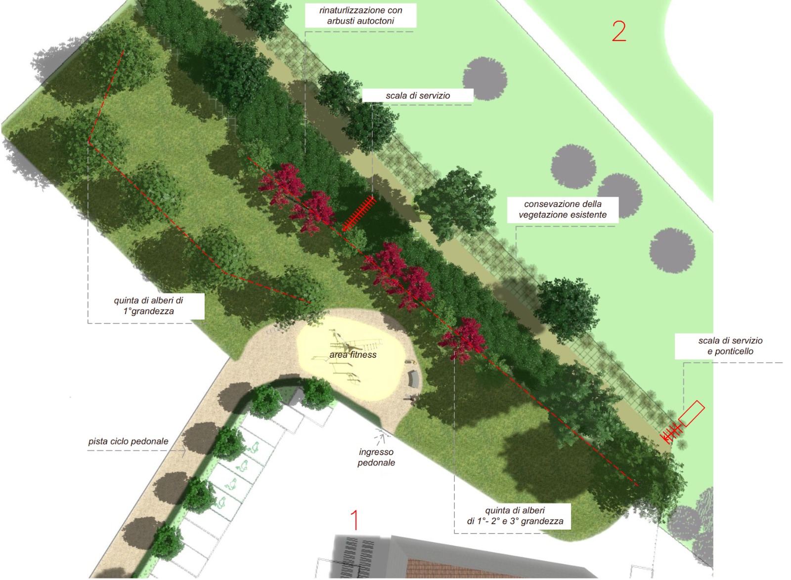 Sul declivio tra il vallo delle mura e l'area verde da un lato è prevista ora la rinaturalizzazione con piantumazione di nuovi alberi e arbusti della scarpata a monte. Verrà poi mantenuta la vegetazione esistente sulla scarpata a valle, in continuità con il contesto ambientale circostante. Sono inoltre previste due scale in legno e ghiaia destinate esclusivamente agli operatori per la manutenzione del verde.