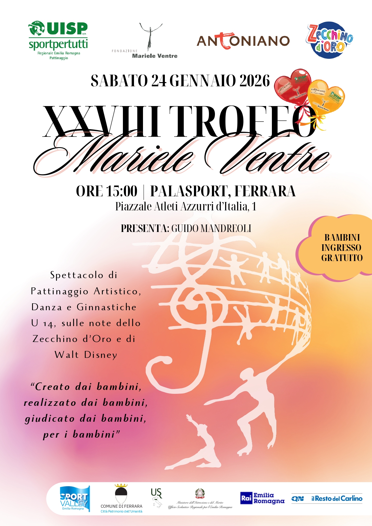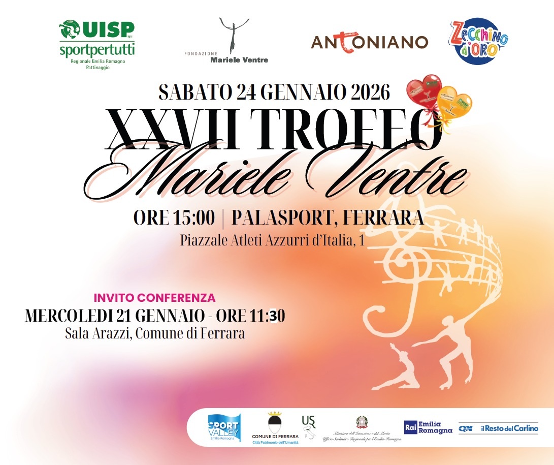LA SCHEDA a cura degli organizzatori - Il Trofeo Mariele Ventre torna anche nel 2026 con la sua XXVIII edizione. La storica manifestazione di Pattinaggio Artistico organizzata da Uisp Emilia-Romagna e Fondazione Mariele Ventre, in collaborazione con Antoniano Opere Francescane di Bologna, porterà sabato 24 gennaio 2026 oltre 500 atleti/e sulla pista del PalaSport di Ferrara per una giornata all'insegna dello sportpertutti, sulle note dello Zecchino d'Oro.