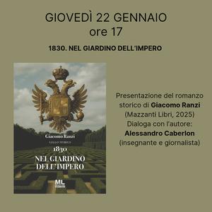 Intrighi politici, passioni, segreti e colpi di scena: sono gli ingredienti del romanzo storico di Giacomo Ranzi (Mazzanti Libri, 2025) "1830. Nel giardino dell'Impero" che giovedì 22 gennaio 2026 alle 17:00 sarà presentato nella sala Agnelli della biblioteca comunale Ariostea (via Scienze 17, Ferrara).